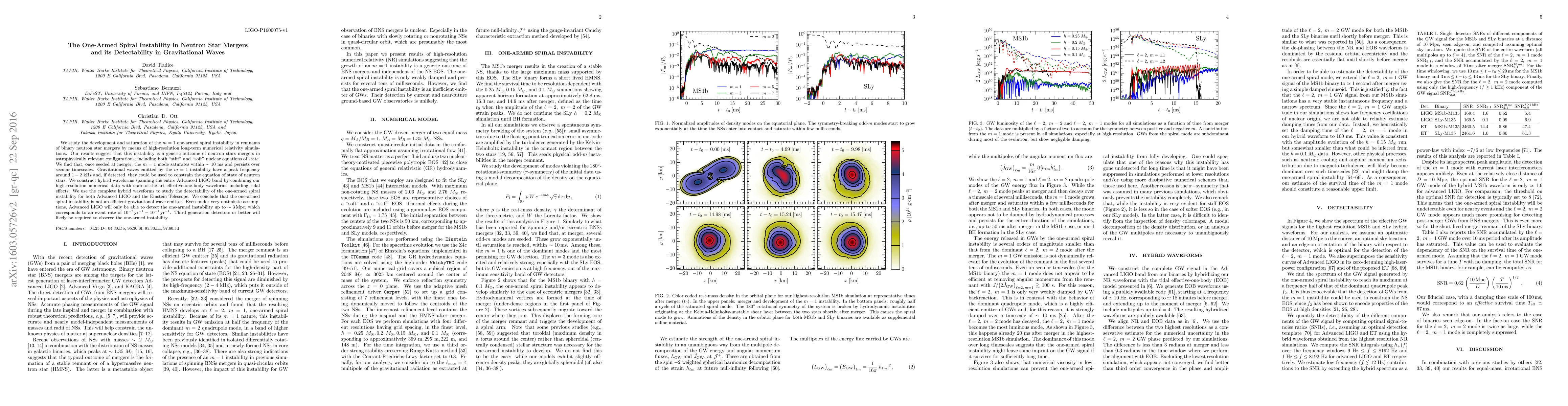 This paper investigates the $m=1$ one-armed spiral instability in neutron star merger remnants, finding it to be a common outcome across various nuclear equations of state. The study concludes that while gravitational waves from this instability could provide insights into neutron star properties, current detectors are unlikely to detect them, necessitating third-generation interferometers for potential observation.
