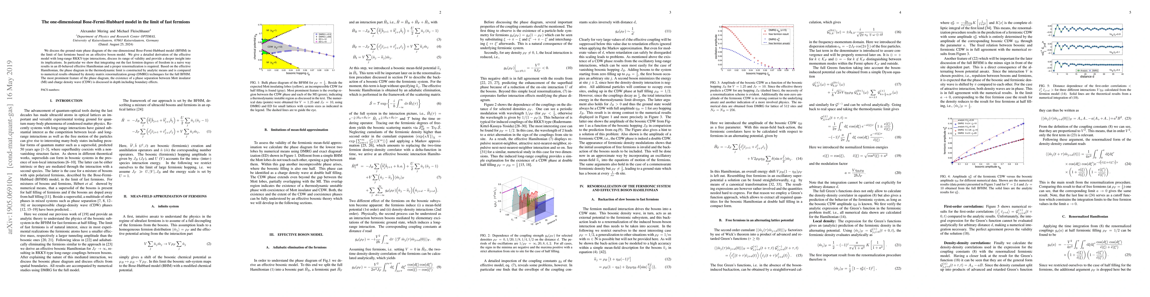 We discuss the ground-state phase diagram of the one-dimensional Bose-Fermi-Hubbard model (BFHM) in the limit of fast fermions based on an effective boson model. We give a detailed derivation of the effective model with long-range RKKY-type interactions, discuss its range of validity and provide a deeper insight into its implications. In particular we show that integrating out the fast fermion degrees of freedom in a naive way results in an ill-behaved effective Hamiltonian and a proper renormalization is required. Based on the effective Hamiltonian, the phase diagram in the thermodynamic limit is constructed by analytic means and is compared to numerical results obtained by density matrix renormalization group (DMRG) techniques for the full BFHM. The most prominent feature of the phase diagram, the existence of a phase separation between Mott insulator (MI) and charge density wave (CDW) is discussed in depth including boundary effects.