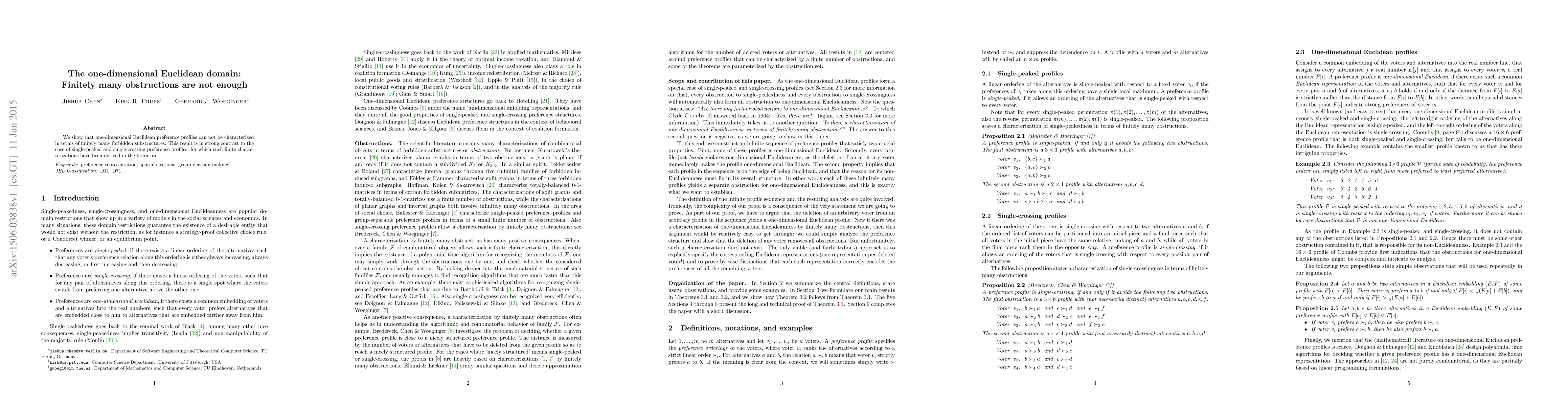 Summary: This paper demonstrates that one-dimensional Euclidean preference profiles cannot be characterized by a finite set of forbidden substructures, contrasting with the finite characterizations found for single-peaked and single-crossing profiles.