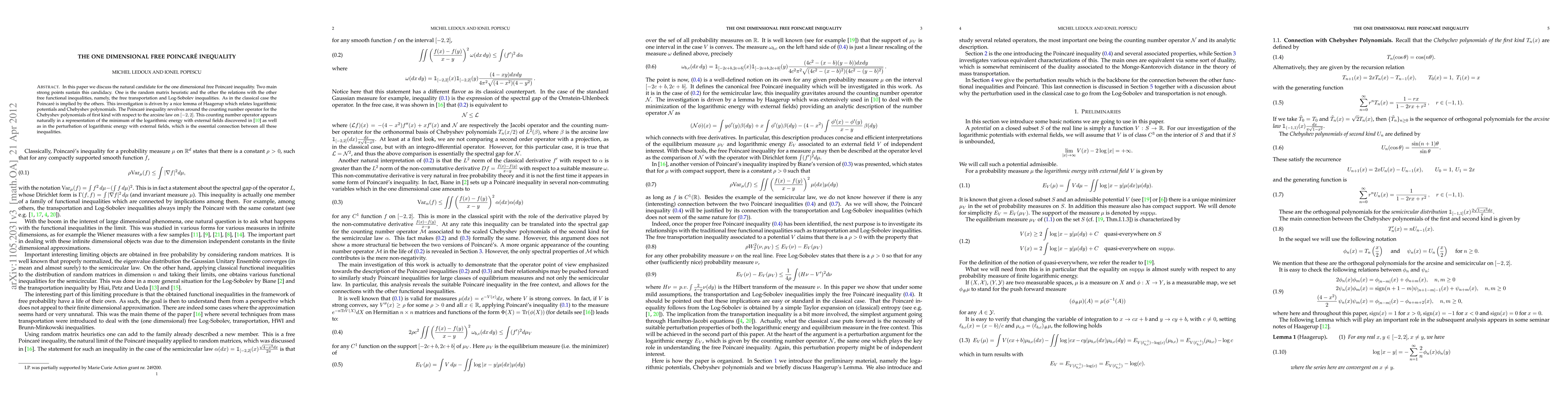 This paper explores the one-dimensional free Poincaré inequality, supported by random matrix heuristics and connections to free transportation and Log-Sobolev inequalities. The investigation leverages a lemma by Haagerup linking logarithmic potentials and Chebyshev polynomials, focusing on the counting number operator for Chebyshev polynomials of the first kind.