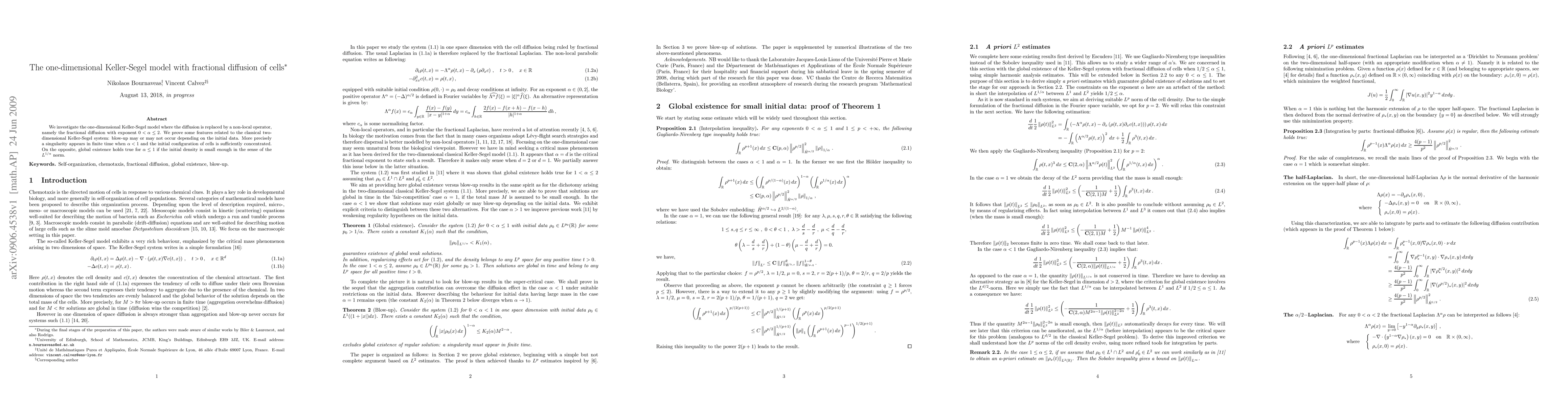 This paper examines the one-dimensional Keller-Segel model with fractional diffusion, showing that blow-up can occur for sufficiently concentrated initial data when the diffusion exponent $\alpha<1$, while global existence is possible for $\alpha\leq1$ if the initial density is small enough in the $L^{1/\alpha}$ norm.