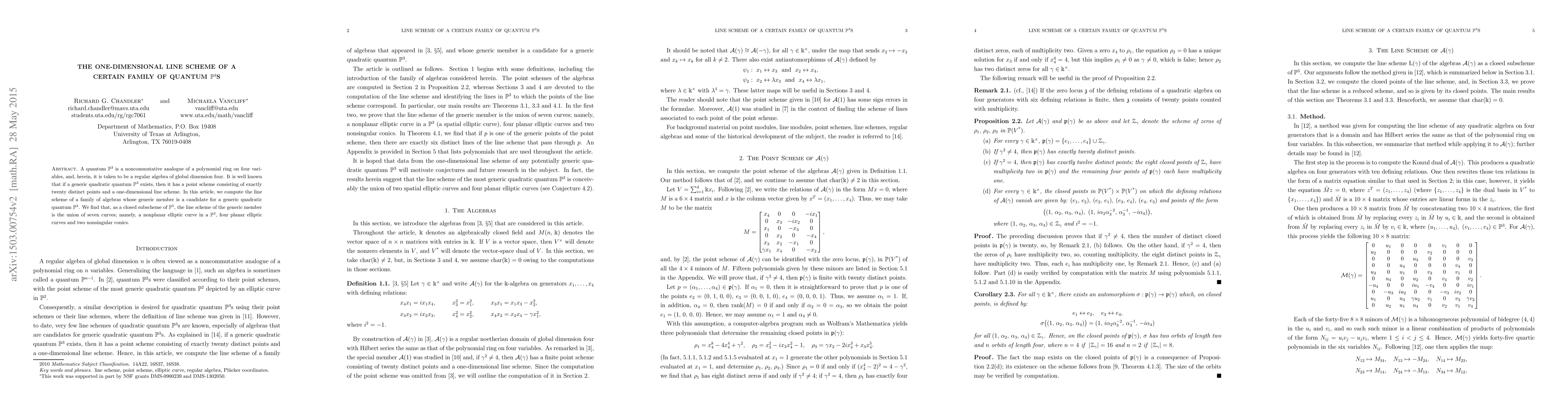 A quantum ${\mathbb P}^3$ is a noncommutative analogue of a polynomial ring on four variables, and, herein, it is taken to be a regular algebra of global dimension four. It is well known that if a generic quadratic quantum ${\mathbb P}^3$ exists, then it has a point scheme consisting of exactly twenty distinct points and a one-dimensional line scheme. In this article, we compute the line scheme of a family of algebras whose generic member is a candidate for a generic quadratic quantum ${\mathbb P}^3$. We find that, as a closed subscheme of ${\mathbb P}^5$, the line scheme of the generic member is the union of seven curves; namely, a nonplanar elliptic curve in a ${\mathbb P}^3$, four planar elliptic curves and two nonsingular conics.