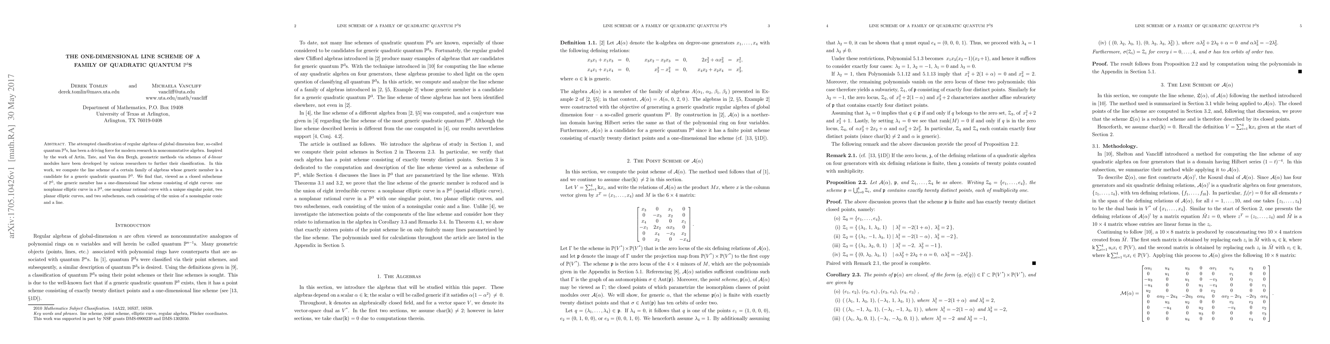 The attempted classification of regular algebras of global dimension four, so-called quantum $\mathbb P^3$s, has been a driving force for modern research in noncommutative algebra. Inspired by the work of Artin, Tate, and Van den Bergh, geometric methods via schemes of $d$-linear modules have been developed by various researchers to further their classification. In this work, we compute the line scheme of a certain family of algebras whose generic member is a candidate for a generic quadratic quantum $\mathbb P^3$. We find that, viewed as a closed subscheme of $\mathbb P^5$, the generic member has a one-dimensional line scheme consisting of eight curves: one nonplanar elliptic curve in a $\mathbb P^3$, one nonplanar rational curve with a unique singular point, two planar elliptic curves, and two subschemes, each consisting of the union of a nonsingular conic and a line.