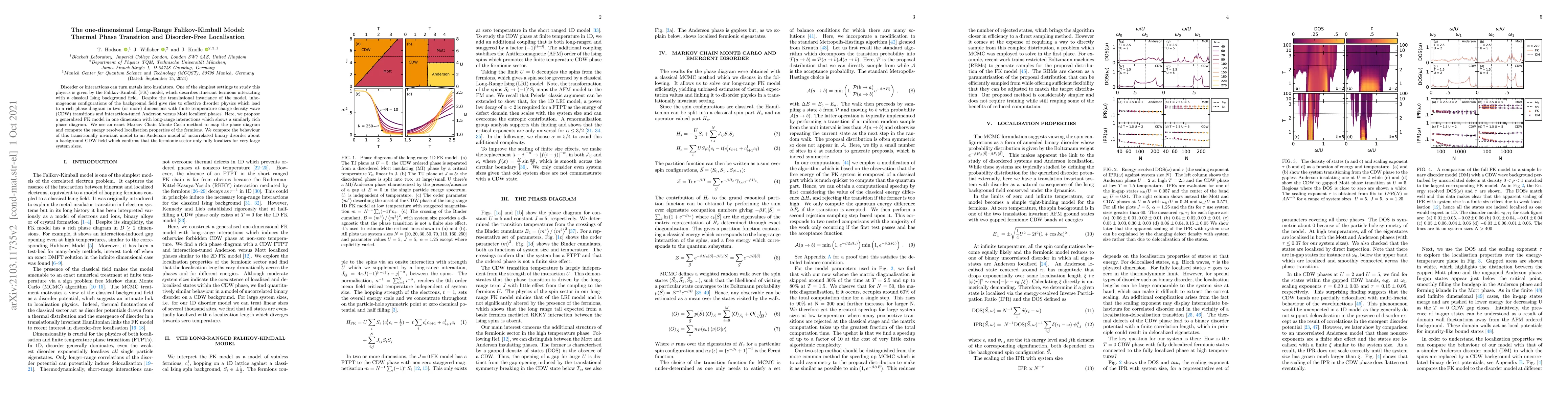 Disorder or interactions can turn metals into insulators. One of the simplest settings to study this physics is given by the Falikov-Kimball model, which describes itinerant fermions interacting with a classical Ising background field. Despite the translational invariance of the model, inhomogenous configurations of the background field give rise to effective disorder physics which lead to a rich phase diagram in two (or more) dimensions with finite temperature charge density wave (CDW) transitions and interaction-tuned Anderson versus Mott localized phases. Here, we propose a generalised Falikov-Kimball model in one dimension with long-range interactions which shows a similarly rich phase diagram. We use an exact Markov Chain Monte Carlo method to map the phase diagram and compute the energy resolved localisation properties of the fermions. We compare the behaviour of this transitionally invariant model to an Anderson model of uncorrelated binary disorder about a background CDW field which confirms that the fermionic sector only fully localizes for very large system sizes.