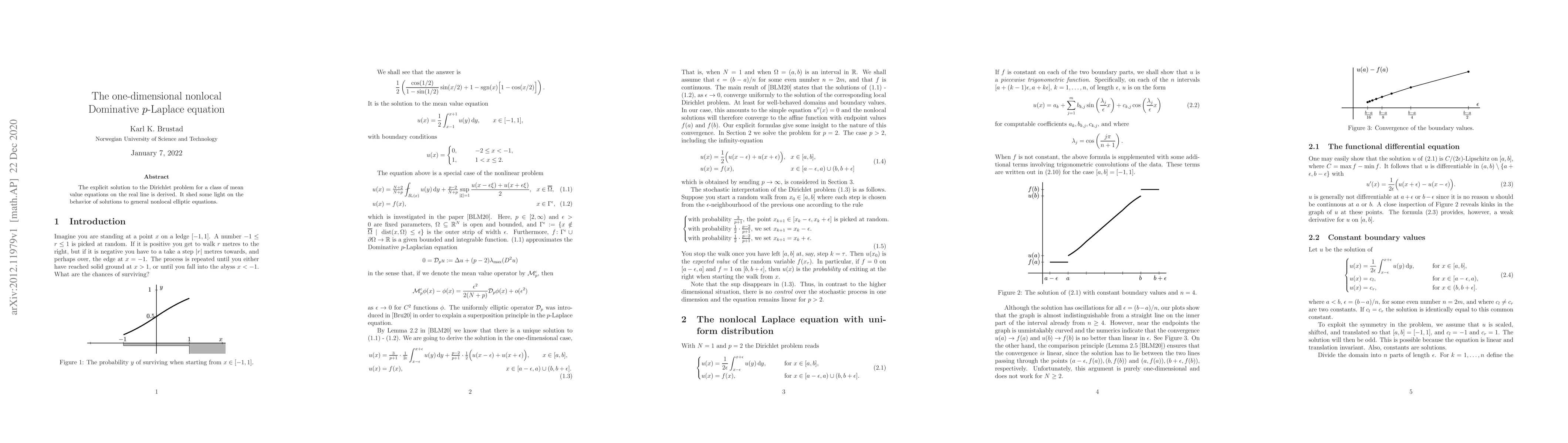 The explicit solution to the Dirichlet problem for a class of mean value equations on the real line is derived. It shed some light on the behavior of solutions to general nonlocal elliptic equations.