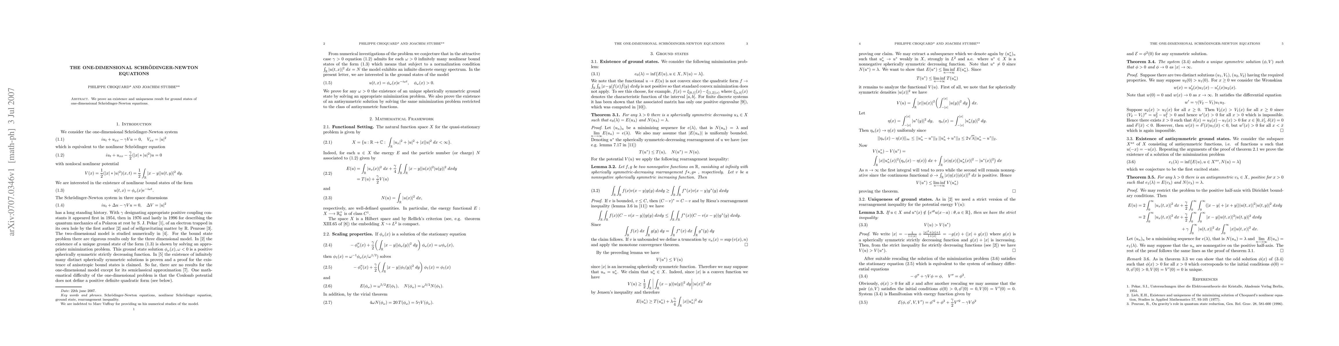 Summary: This paper establishes the existence and uniqueness of ground states for the one-dimensional Schrödinger-Newton equations, providing a foundational result for the study of these hybrid quantum-gravitational systems.
