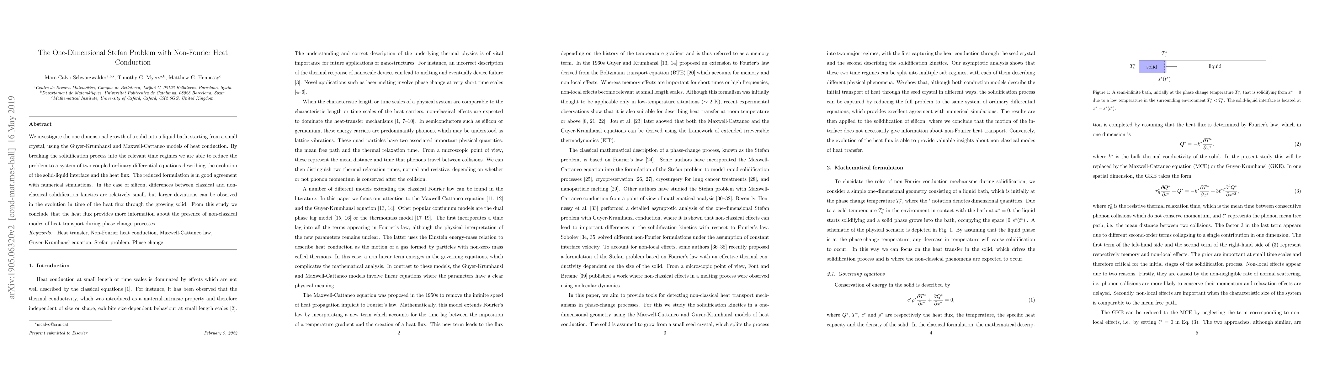 We investigate the one-dimensional growth of a solid into a liquid bath, starting from a small crystal, using the Guyer-Krumhansl and Maxwell-Cattaneo models of heat conduction. By breaking the solidification process into the relevant time regimes we are able to reduce the problem to a system of two coupled ordinary differential equations describing the evolution of the solid-liquid interface and the heat flux. The reduced formulation is in good agreement with numerical simulations. In the case of silicon, differences between classical and non-classical solidification kinetics are relatively small, but larger deviations can be observed in the evolution in time of the heat flux through the growing solid. From this study we conclude that the heat flux provides more information about the presence of non-classical modes of heat transport during phase-change processes.