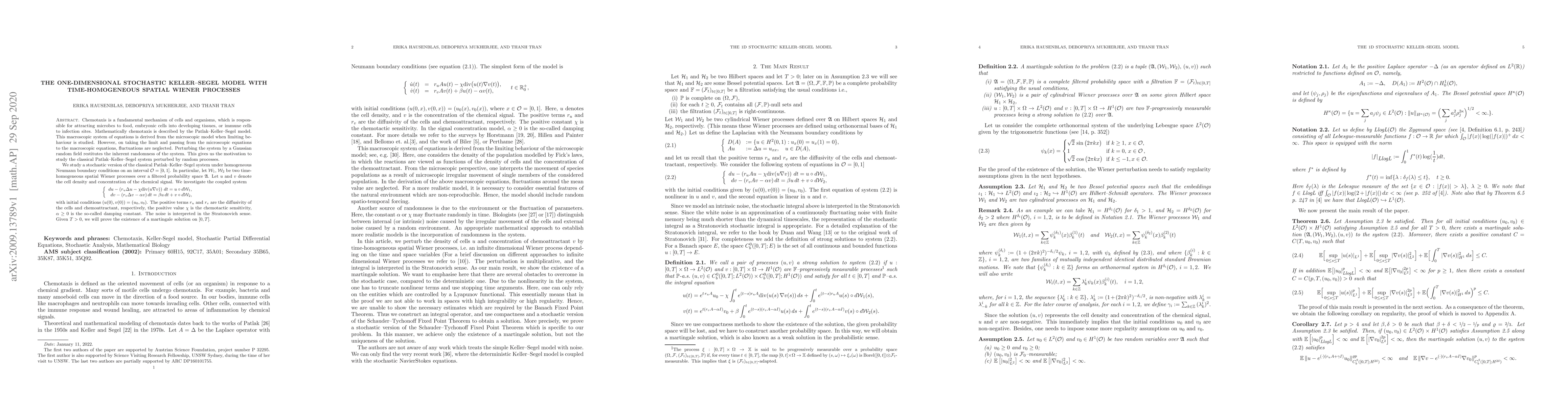 Chemotaxis is a fundamental mechanism of cells and organisms, which is responsible for attracting microbes to food, embryonic cells into developing tissues, or immune cells to infection sites. Mathematically chemotaxis is described by the Patlak--Keller--Segel model. This macroscopic system of equations is derived from the microscopic model when limiting behaviour is studied. However, on taking the limit and passing from the microscopic equations to the macroscopic equations, fluctuations are neglected. Perturbing the system by a Gaussian random field restitutes the inherent randomness of the system. This gives us the motivation to study the classical Patlak--Keller--Segel system perturbed by random processes. We study a stochastic version of the classical Patlak--Keller--Segel system under homogeneous Neumann boundary conditions on an interval $\mathcal{O}=[0,1]$. In particular, let $\mathcal{W}_1$, $\mathcal{W}_2$ be two time-homogeneous spatial Wiener processes over a filtered probability space $\mathfrak{A}$. Let $u$ and $v$ denote the cell density and concentration of the chemical signal. We investigate the coupled system \begin{align*} & d {u} - ( r_u\Delta u- \chi {\rm div }( u\nabla v) )\, dt =u\circ d\mathcal{W}_1, \\ & d{v} -(r_v \Delta v -\alpha v)\, dt = \beta u \, dt+ v\circ d\mathcal{W}_2, \end{align*} with initial conditions $(u(0),v(0))=(u_0,v_0)$. The positive terms $r_u$ and $r_v$ are the diffusivity of the cells and chemoattractant, respectively, the positive value $\chi$ is the chemotactic sensitivity, $\alpha\ge0$ is the so-called damping constant. The noise is interpreted in the Stratonovich sense. Given $T>0$, we will prove the existence of a martingale solution on $[0,T]$.