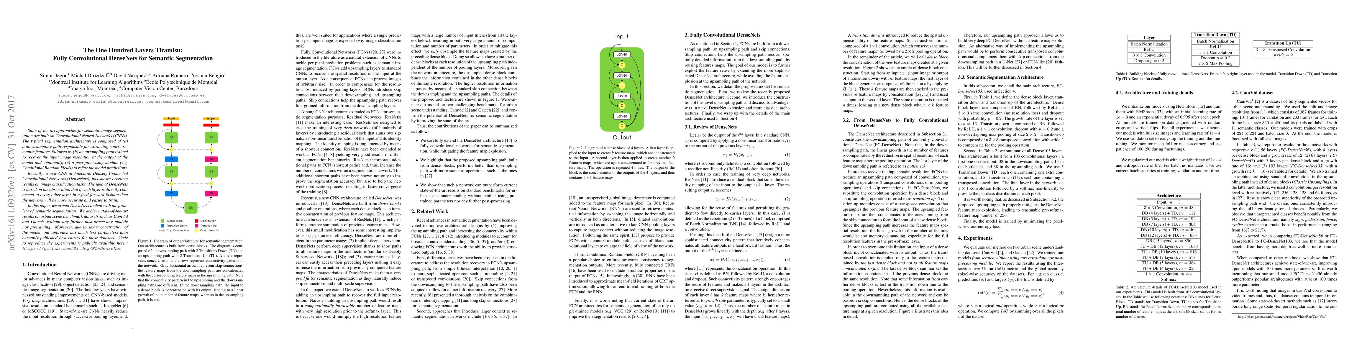 This paper presents Fully Convolutional DenseNets for semantic segmentation, achieving state-of-the-art results on urban scene datasets like CamVid and Gatech. The approach leverages the DenseNet architecture, which connects each layer to every other layer, to enhance accuracy and training efficiency, resulting in fewer parameters compared to existing methods.