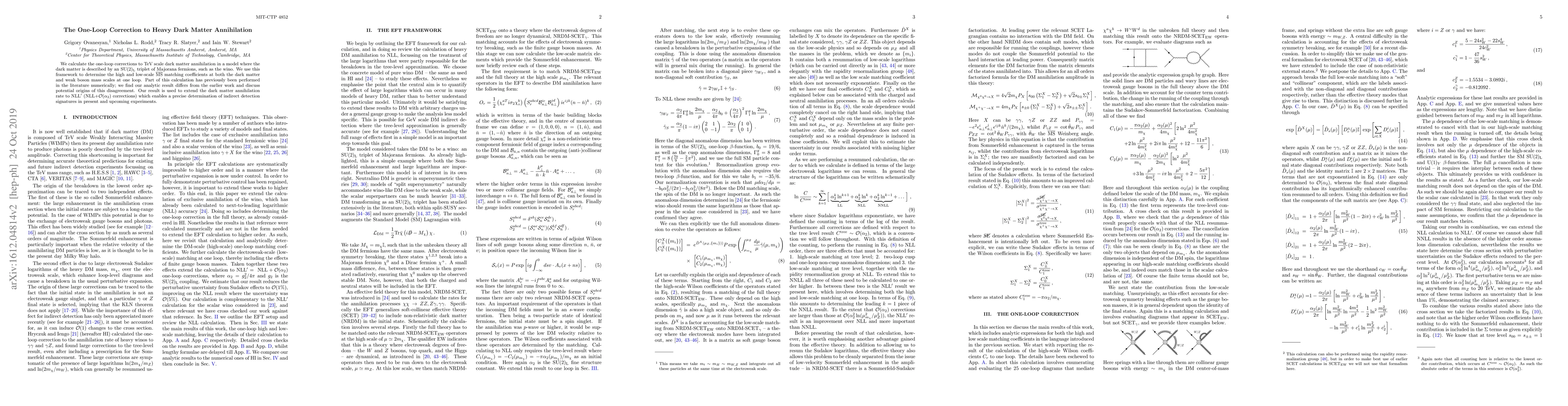 We calculate the one-loop corrections to TeV scale dark matter annihilation in a model where the dark matter is described by an SU(2)$_L$ triplet of Majorana fermions, such as the wino. We use this framework to determine the high and low-scale MS-bar matching coefficients at both the dark matter and weak boson mass scales at one loop. Part of this calculation has previously been performed in the literature numerically; we find our analytic result differs from the earlier work and discuss potential origins of this disagreement. Our result is used to extend the dark matter annihilation rate to NLL' (NLL+O($\alpha_2$) corrections) which enables a precise determination of indirect detection signatures in present and upcoming experiments.