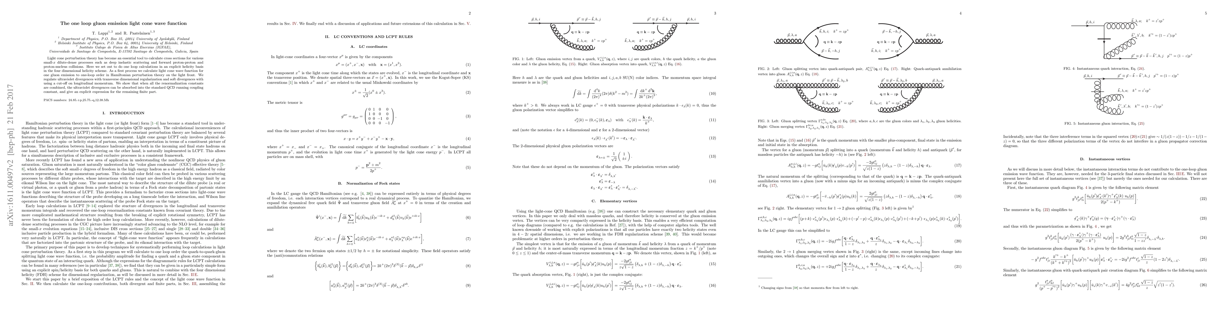 This paper calculates the one-loop gluon emission light cone wave function using light cone perturbation theory, focusing on the four-dimensional helicity scheme. It demonstrates that ultraviolet divergences can be absorbed into the QCD running coupling constant, providing an explicit expression for the finite part.