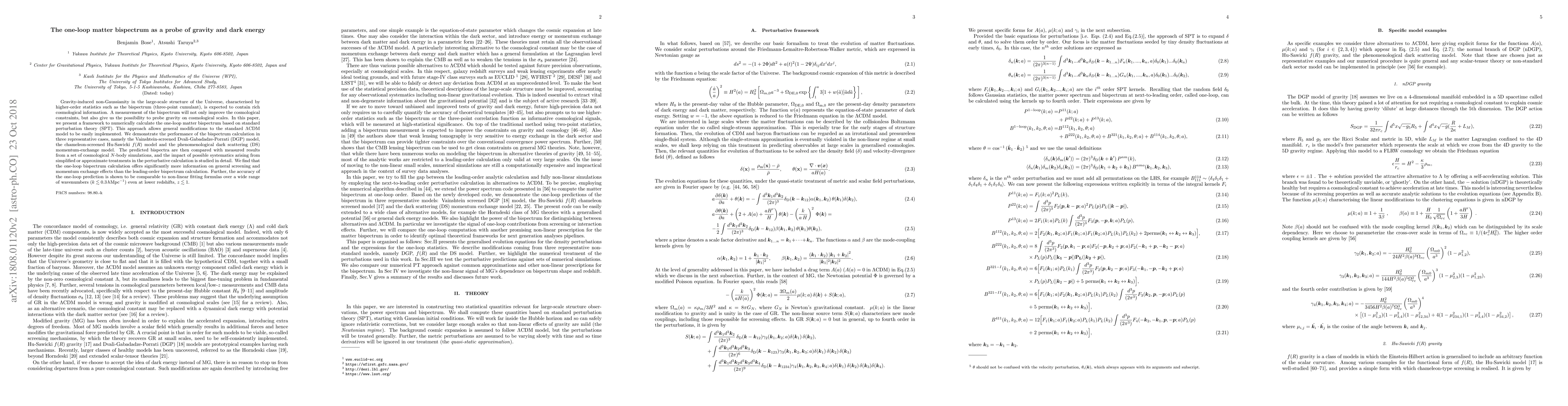 This paper develops a numerical framework to calculate the one-loop matter bispectrum using standard perturbation theory, enabling the probing of gravity and dark energy models. It demonstrates the framework's effectiveness in assessing modifications to the $\Lambda$CDM model and finds that the one-loop bispectrum provides more detailed information on screening and momentum exchange effects compared to leading-order calculations.