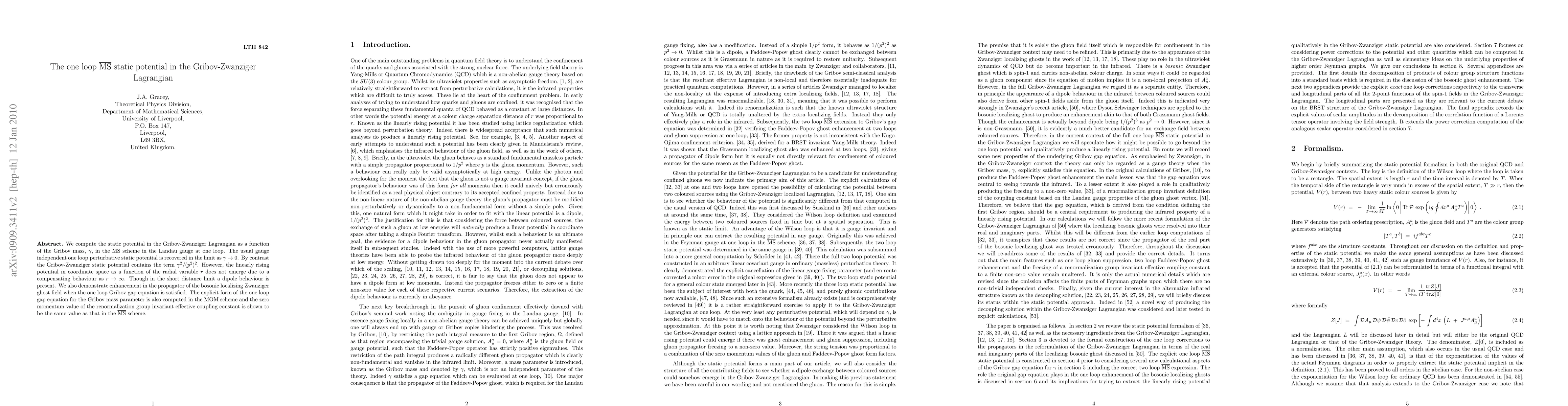 This research computes the one-loop MSbar static potential in the Gribov-Zwanziger Lagrangian, revealing a term γ²/(p²)², and demonstrates that despite this, a linearly rising potential does not arise due to compensating behavior. Additionally, it shows enhancement in the propagator of the Zwanziger ghost field and computes the one-loop gap equation in the MOM scheme.