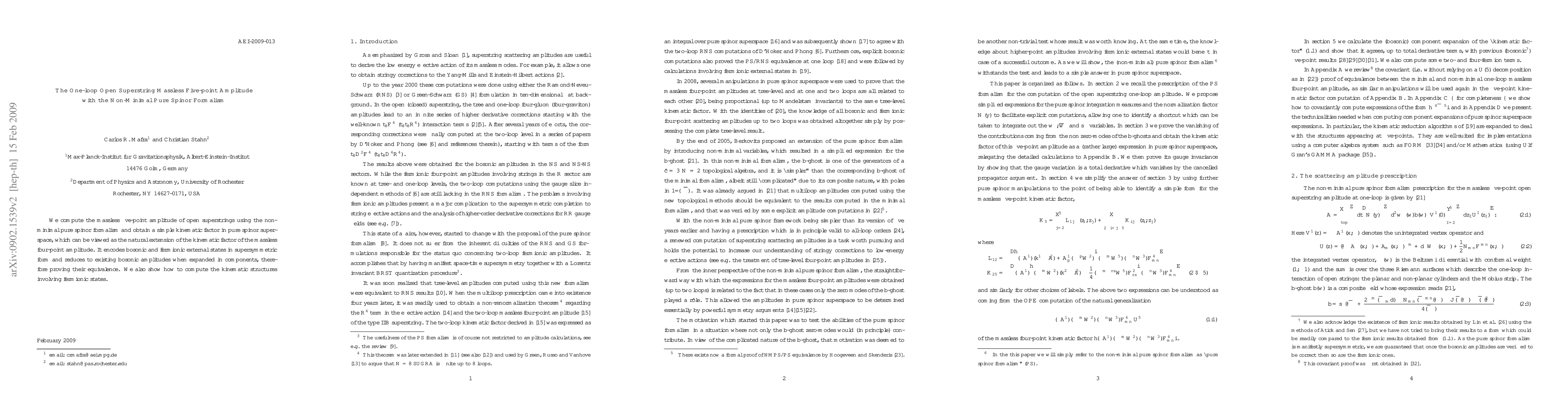 This paper computes the massless five-point amplitude for open superstrings using the non-minimal pure spinor formalism, revealing a simple kinematic factor in pure spinor superspace. This factor encompasses both bosonic and fermionic states in a supersymmetric form and confirms the equivalence with existing bosonic amplitudes.