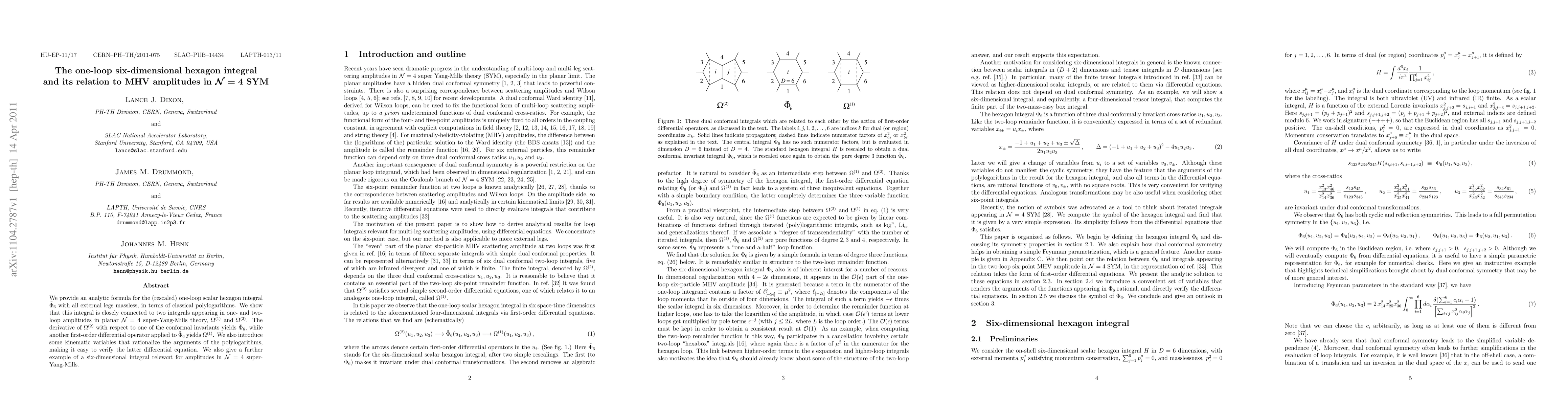 We provide an analytic formula for the (rescaled) one-loop scalar hexagon integral $\tilde\Phi_6$ with all external legs massless, in terms of classical polylogarithms. We show that this integral is closely connected to two integrals appearing in one- and two-loop amplitudes in planar $\\mathcal{N}=4$ super-Yang-Mills theory, $\Omega^{(1)}$ and $\Omega^{(2)}$. The derivative of $\Omega^{(2)}$ with respect to one of the conformal invariants yields $\tilde\Phi_6$, while another first-order differential operator applied to $\tilde\Phi_6$ yields $\Omega^{(1)}$. We also introduce some kinematic variables that rationalize the arguments of the polylogarithms, making it easy to verify the latter differential equation. We also give a further example of a six-dimensional integral relevant for amplitudes in $\\mathcal{N}=4$ super-Yang-Mills.