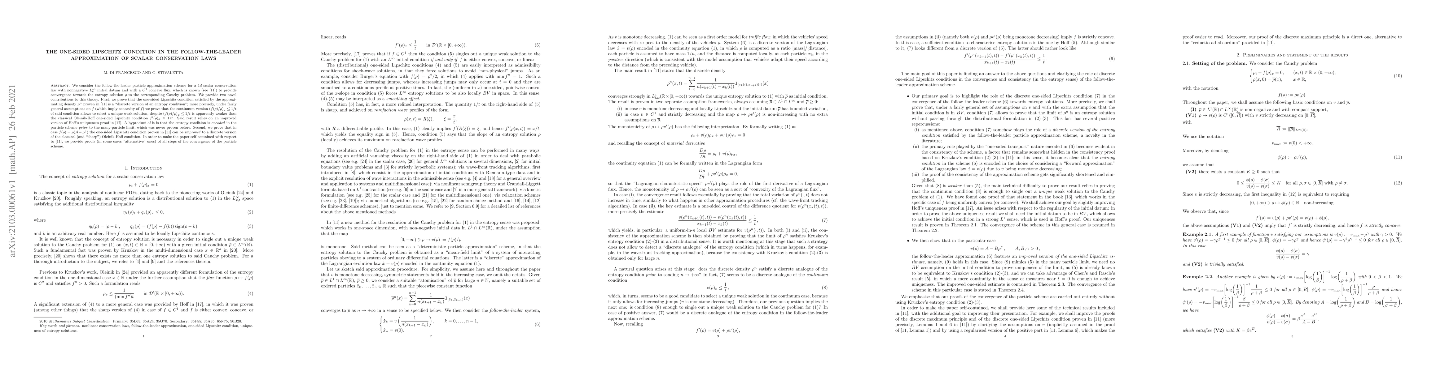 We consider the follow-the-leader particle approximation scheme for a $1d$ scalar conservation law with nonnegative $L^\infty_c$ initial datum and with a $C^1$ concave flux, which is known to provide convergence towards the entropy solution $\rho$ to the corresponding Cauchy problem. We provide two novel contributions to this theory. First, we prove that the one-sided Lipschitz condition satisfied by the approximating density $\rho^n$ is a discrete version of an entropy condition; more precisely, under fairly general assumptions on $f$ (which imply concavity of $f$) we prove that the continuum version $\left(f(\rho)/\rho\right)_x\leq 1/t$ of said condition allows to select a unique weak solution, despite $\left(f(\rho)/\rho\right)_x\leq 1/t$ is apparently weaker than the classical Oleinik-Hoff one-sided Lipschitz condition $f'(\rho)_x\leq 1/t$. Said result relies on an improved version of Hoff's uniqueness proof. A byproduct of it is that the entropy condition is encoded in the particle scheme prior to the many-particle limit, which was never proven before. Second, we prove that in case $f(\rho)=\rho(A-\rho^\gamma)$ the one-sided Lipschitz condition can be improved to a discrete version of the classical (and sharp) Oleinik-Hoff condition. In order to make the paper self-contained, we provide proofs (in some cases alternative ones) of all steps of the convergence of the particle scheme.