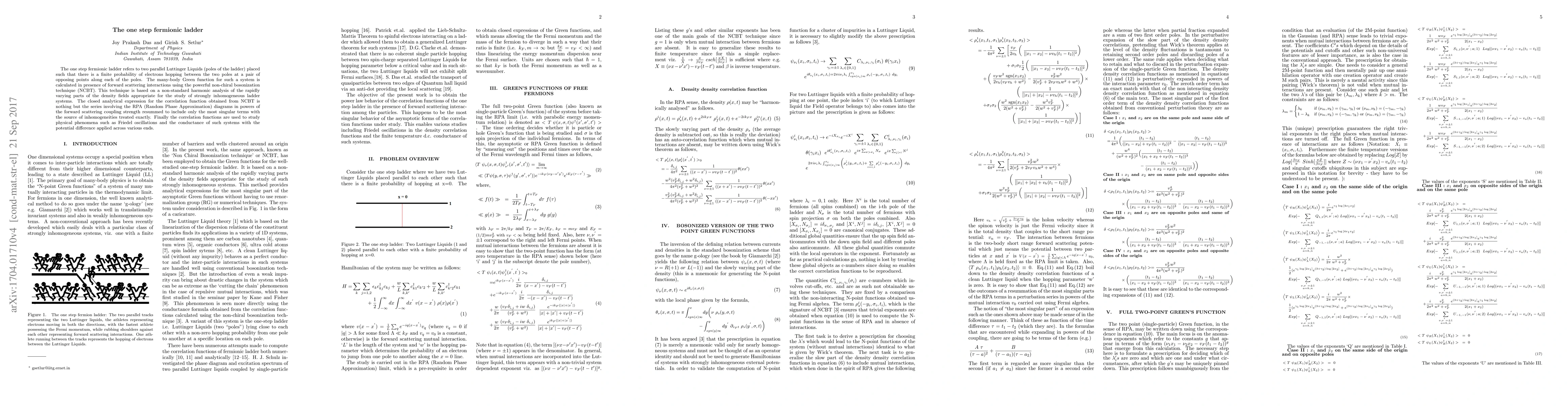 The one step fermionic ladder refers to two parallel Luttinger Liquids (poles of the ladder) placed such that there is a finite probability of electrons hopping between the two poles at a pair of opposing points along each of the poles. The many-body Green function for such a system is calculated in presence of forward scattering interactions using the powerful non-chiral bosonization technique (NCBT). This technique is based on a non-standard harmonic analysis of the rapidly varying parts of the density fields appropriate for the study of strongly inhomogeneous ladder systems. The closed analytical expression for the correlation function obtained from NCBT is nothing but the series involving the RPA (Random Phase Approximation) diagrams in powers of the forward scattering coupling strength resummed to include only the most singular terms with the source of inhomogeneities treated exactly. Finally the correlation functions are used to study physical phenomena such as Friedel oscillations and the conductance of such systems with the potential difference applied across various ends.