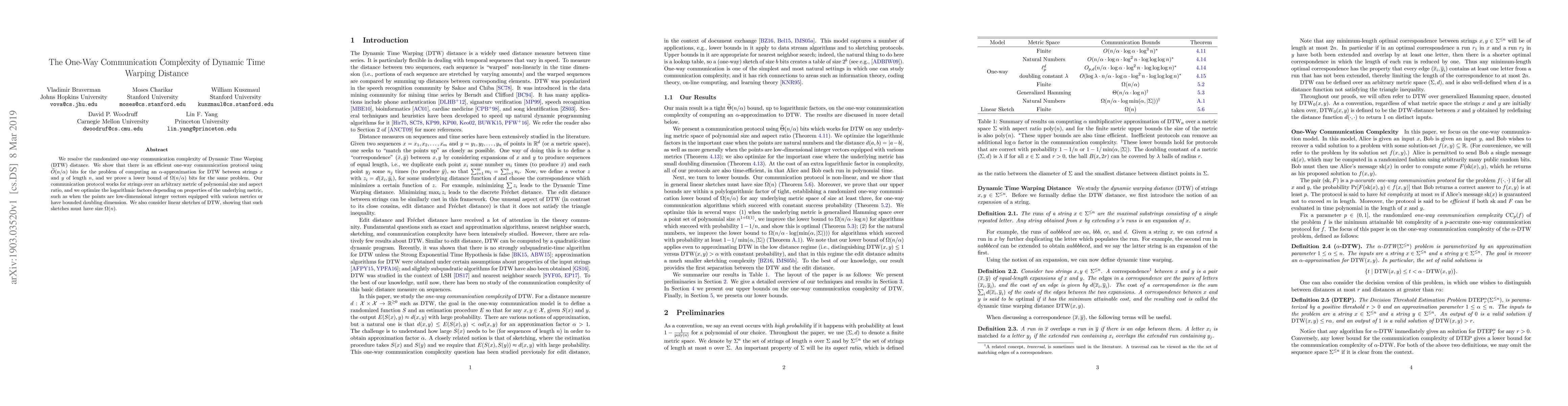 We resolve the randomized one-way communication complexity of Dynamic Time Warping (DTW) distance. We show that there is an efficient one-way communication protocol using $\widetilde{O}(n/\alpha)$ bits for the problem of computing an $\alpha$-approximation for DTW between strings $x$ and $y$ of length $n$, and we prove a lower bound of $\Omega(n / \alpha)$ bits for the same problem. Our communication protocol works for strings over an arbitrary metric of polynomial size and aspect ratio, and we optimize the logarithmic factors depending on properties of the underlying metric, such as when the points are low-dimensional integer vectors equipped with various metrics or have bounded doubling dimension. We also consider linear sketches of DTW, showing that such sketches must have size $\Omega(n)$.