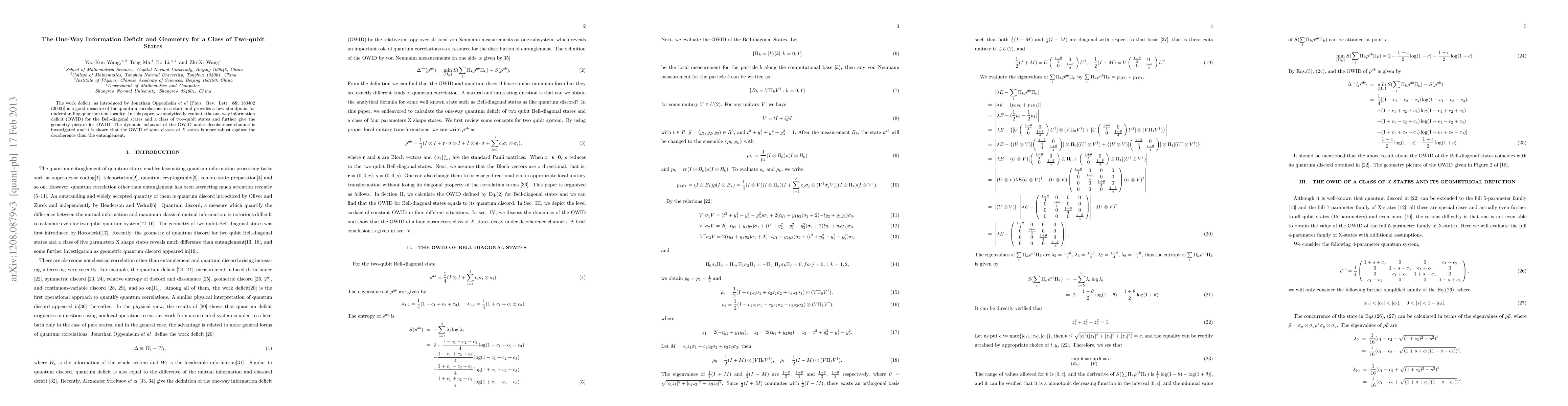 This paper evaluates the one-way information deficit (OWID) for Bell-diagonal and a class of two-qubit states, providing a geometric perspective on OWID. It shows that OWID can be more resilient to decoherence than entanglement, particularly for certain $X$ states.