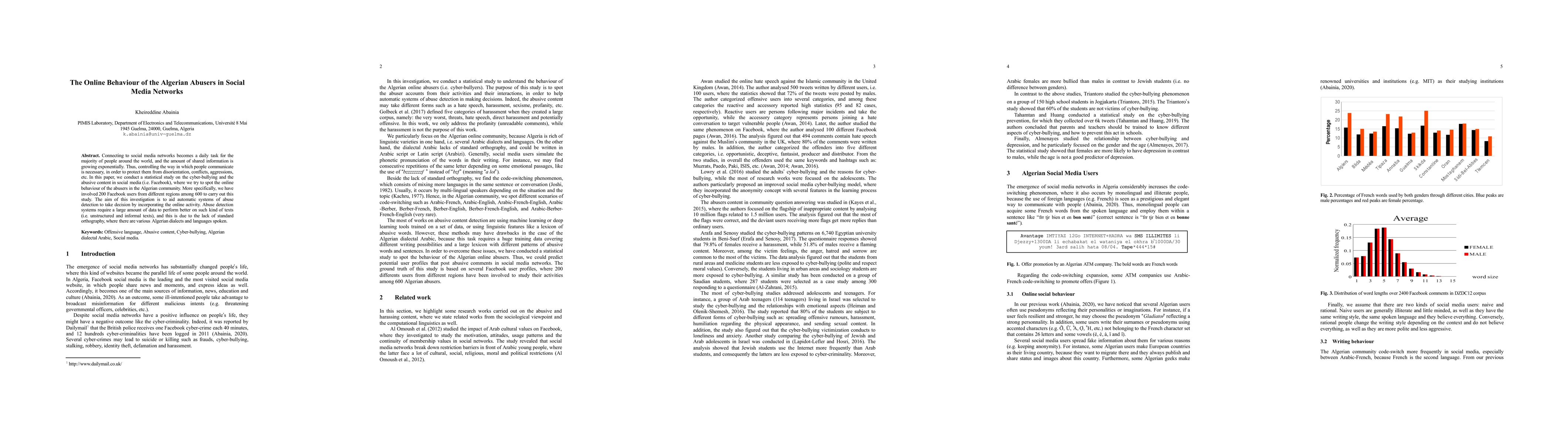 Connecting to social media networks becomes a daily task for the majority of people around the world, and the amount of shared information is growing exponentially. Thus, controlling the way in which people communicate is necessary, in order to protect them from disorientation, conflicts, aggressions, etc. In this paper, we conduct a statistical study on the cyber-bullying and the abusive content in social media (i.e. Facebook), where we try to spot the online behaviour of the abusers in the Algerian community. More specifically, we have involved 200 Facebook users from different regions among 600 to carry out this study. The aim of this investigation is to aid automatic systems of abuse detection to take decision by incorporating the online activity. Abuse detection systems require a large amount of data to perform better on such kind of texts (i.e. unstructured and informal texts), and this is due to the lack of standard orthography, where there are various Algerian dialects and languages spoken.