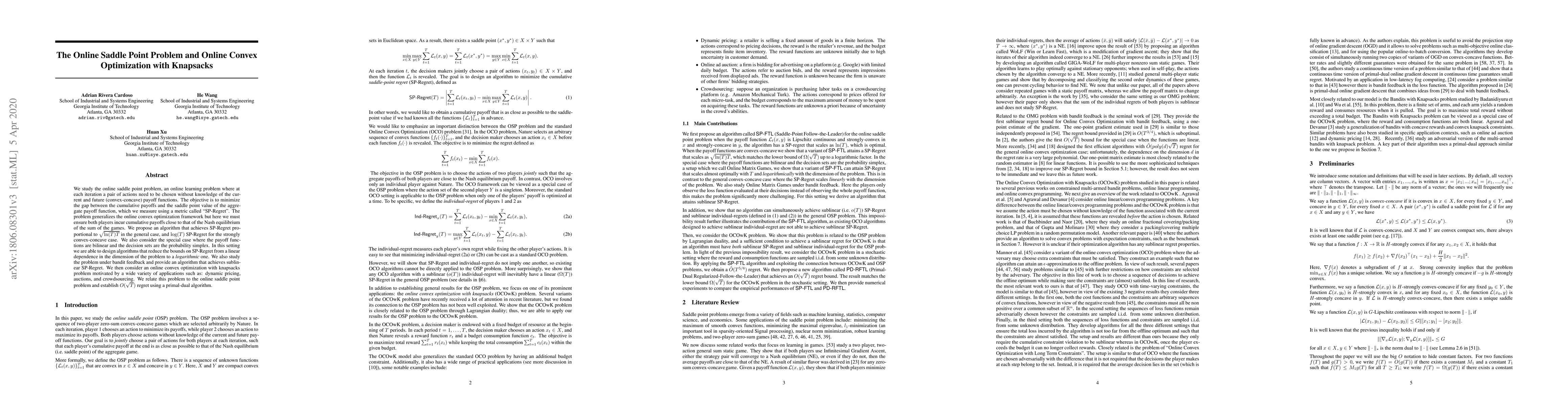 The paper investigates the online saddle point problem, focusing on minimizing regret in scenarios where pairs of actions must be chosen without knowledge of future payoffs. An algorithm is proposed achieving sublinear regret bounds, particularly improving the regret from linear to logarithmic dependence on the problem's dimension for bilinear payoff functions. Additionally, the study extends to an online convex optimization with knapsacks problem, establishing $O(\sqrt{T})$ regret through a primal-dual approach.