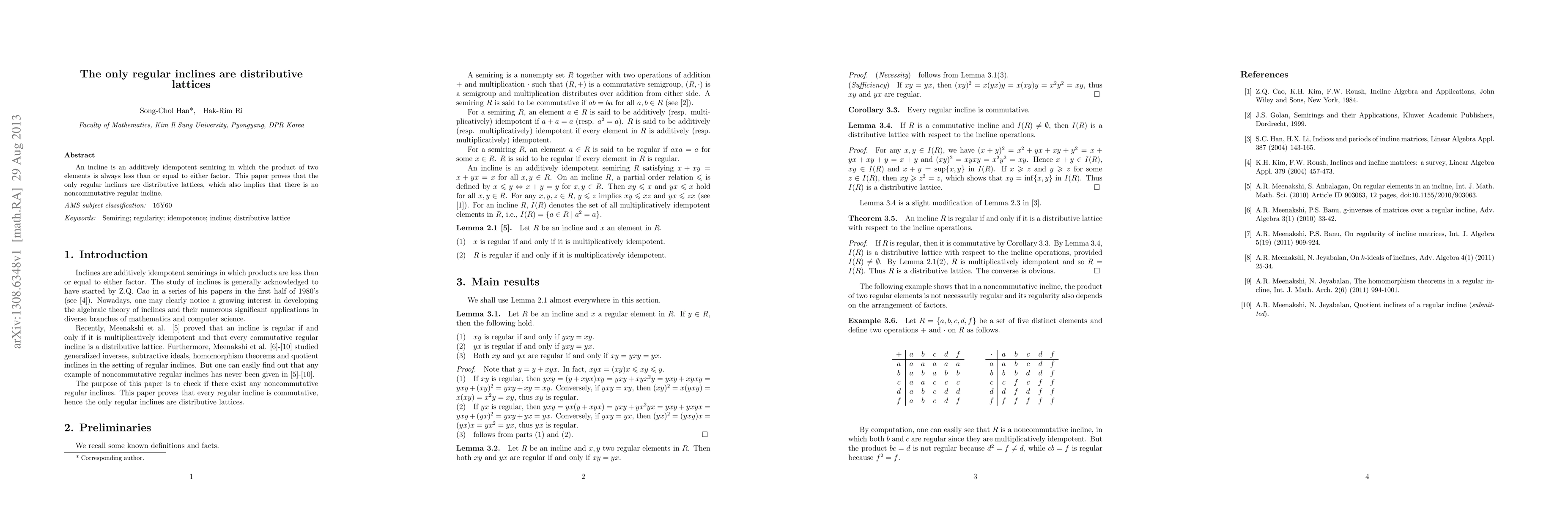 An incline is an additively idempotent semiring in which the product of two elements is always less than or equal to either factor. This paper proves that the only regular inclines are distributive lattices, which also implies that there is no noncommutative regular incline.
