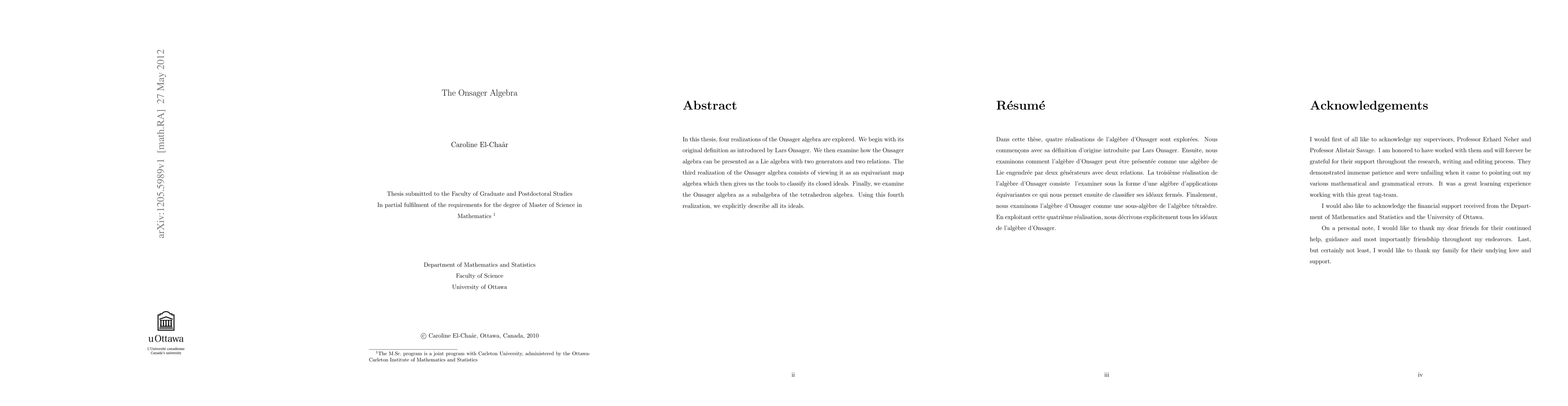 In this thesis, four realizations of the Onsager algebra are explored. We begin with its original definition as introduced by Lars Onsager. We then examine how the Onsager algebra can be presented as a Lie algebra with two generators and two relations. The third realization of the Onsager algebra consists of viewing it as an equivariant map algebra which then gives us the tools to classify its closed ideals. Finally, we examine the Onsager algebra as a subalgebra of the tetrahedron algebra. Using this fourth realization, we explicitly describe all its ideals.