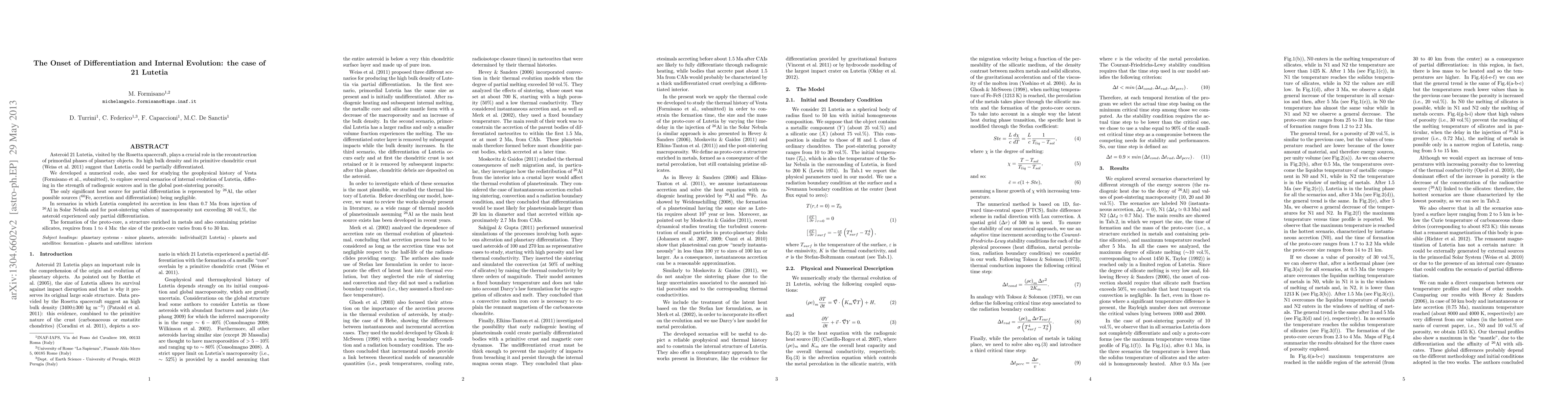 Asteroid 21 Lutetia, visited by the Rosetta spacecraft, plays a crucial role in the reconstruction of primordial phases of planetary objects. Its high bulk density and its primitive chondritic crust (Weiss et al. 2011) suggest that Lutetia could be partially differentiated. We developed a numerical code, also used for studying the geophysical history of Vesta (Formisano et al., submitted), to explore several scenarios of internal evolution of Lutetia, differing in the strength of radiogenic sources and in the global post-sintering porosity. The only significant heat source for partial differentiation is represented by Al26, the other possible sources (Fe60, accretion and differentiation) being negligible. In scenarios in which Lutetia completed its accretion in less than 0.7 Ma from injection of Al26 in Solar Nebula and for post-sintering values of macroporosity not exceeding 30 vol. %, the asteroid experienced only partial differentiation. The formation of the proto-core, a structure enriched in metals and also containing pristine silicates, requires from 1 to 4 Ma: the size of the proto-core varies from 6 to 30 km.