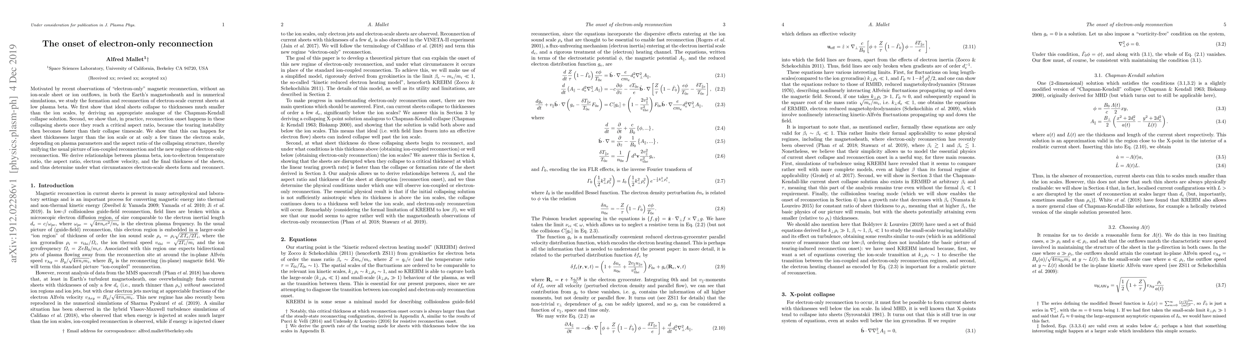 Development of a theoretical model for low-β current sheet formation and disruption by reconnection, predicting electron-only reconnection conditions and outflow velocities.