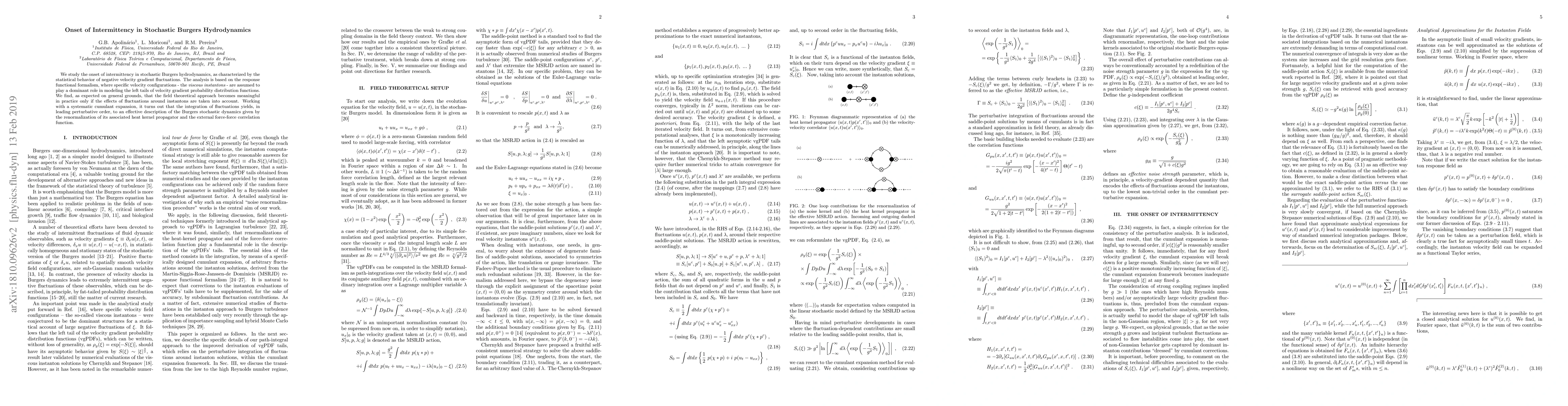 This paper investigates the onset of intermittency in stochastic Burgers hydrodynamics through the statistical behavior of negative velocity gradient fluctuations, employing the response functional formalism and focusing on viscous instantons. The study reveals that a field theoretical approach is only practically meaningful when fluctuations around instantons are considered, leading to a renormalization of the heat kernel propagator and the force-force correlation function.