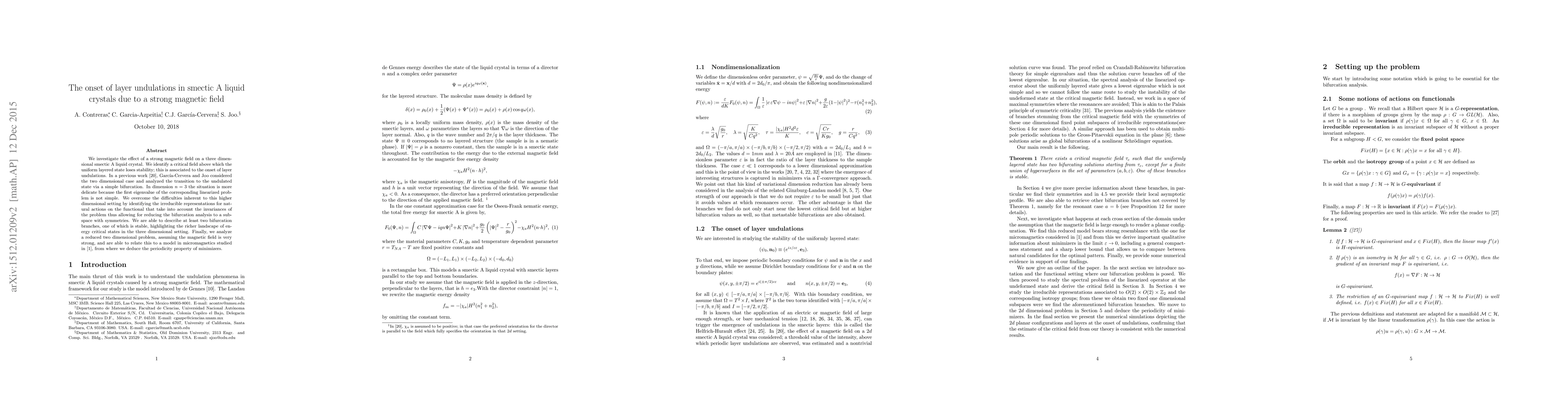 We investigate the effect of a strong magnetic field on a three dimensional smectic A liquid crystal. We identify a critical field above which the uniform layered state loses stability; this is associated to the onset of layer undulations. In a previous work, Garc\'ia-Cervera and Joo considered the two dimensional case and analyzed the transition to the undulated state via a simple bifurcation. In dimension n=3 the situation is more delicate because the first eigenvalue of the corresponding linearized problem is not simple. We overcome the difficulties inherent to this higher dimensional setting by identifying the irreducible representations for natural actions on the functional that take into account the invariances of the problem thus allowing for reducing the bifurcation analysis to a subspace with symmetries. We are able to describe at least two bifurcation branches, one of which is stable, highlighting the richer landscape of energy critical states in the three dimensional setting. Finally, we analyze a reduced two dimensional problem, assuming the magnetic field is very strong, and are able to relate this to a model in micromagnetics studied, from where we deduce the periodicity property of minimizers.
