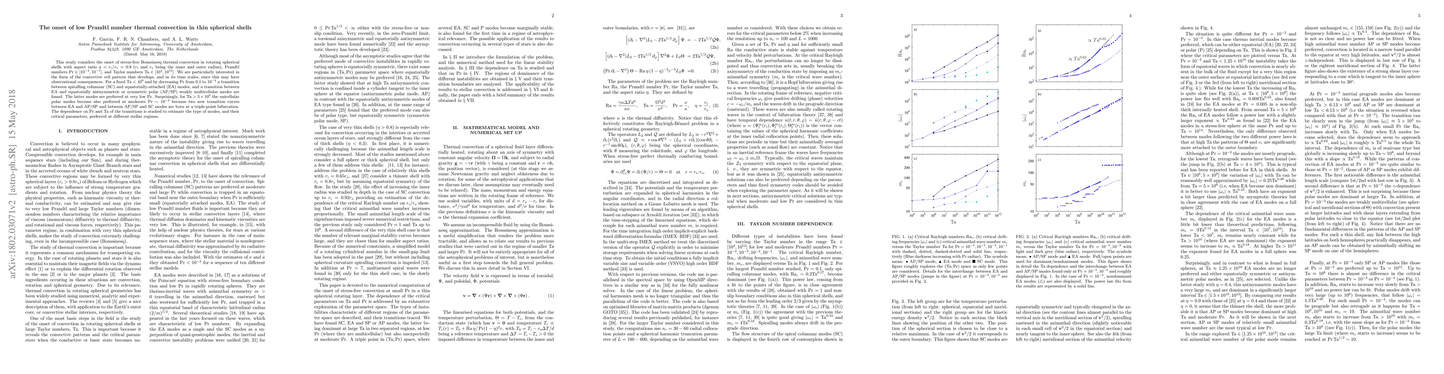 Researchers studied the onset of thermal convection in rotating spherical shells with varying Prandtl numbers and Taylor numbers, finding transitions between different convective cell patterns that occur at specific ranges of these parameters.