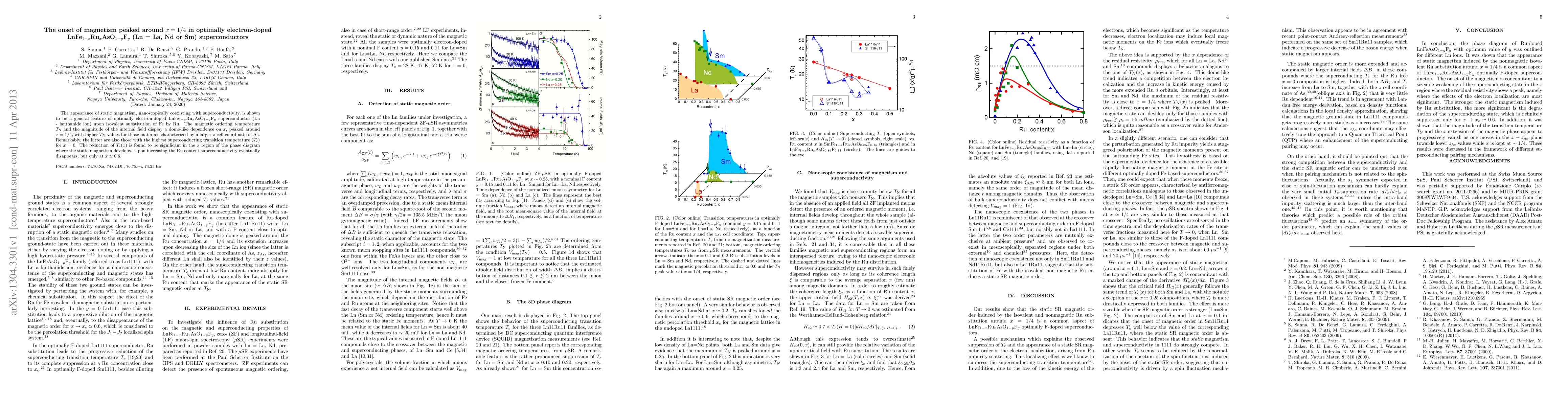 This study reveals that optimally electron-doped LnFe(1-x)Ru(x)AsO(1-y)F(y) superconductors exhibit a peak in static magnetism around x=1/4, coinciding with the highest superconducting transition temperature. The magnetic ordering temperature and internal field show a dome-shaped trend, diminishing as superconductivity fades with increased Ru content.