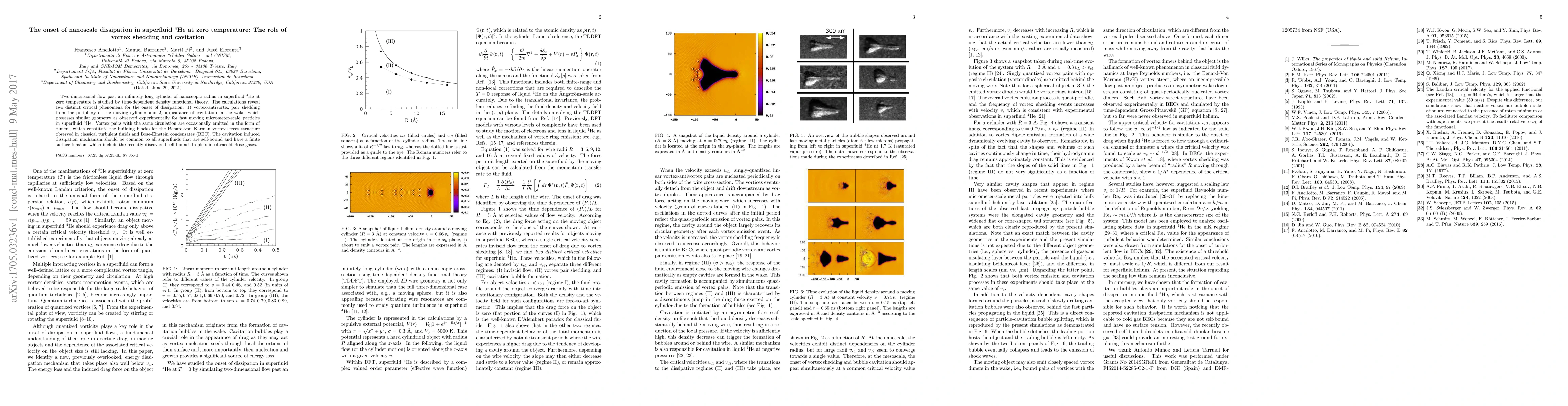 Two-dimensional flow past an infinitely long cylinder of nanoscopic radius in superfluid He-4 at zero temperature is studied by time-dependent density functional theory. The calculations reveal two distinct critical phenomena for the onset of dissipation: 1) vortex-antivortex pair shedding from the periphery of the moving cylinder and 2) appearance of cavitation in the wake, which possesses similar geometry as observed experimentally for fast moving micrometer-scale particles in superfluid He-4. Vortex pairs with the same circulation are occasionally emitted in the form of dimers, which constitute the building blocks for the Benard-von Karman vortex street structure observed in classical turbulent fluids and Bose-Einstein condensates. The cavitation induced dissipation mechanism should be common to all superfluids that are self-bound and have a finite surface tension, which include the recently discovered self-bound droplets in ultracold Bose gases.