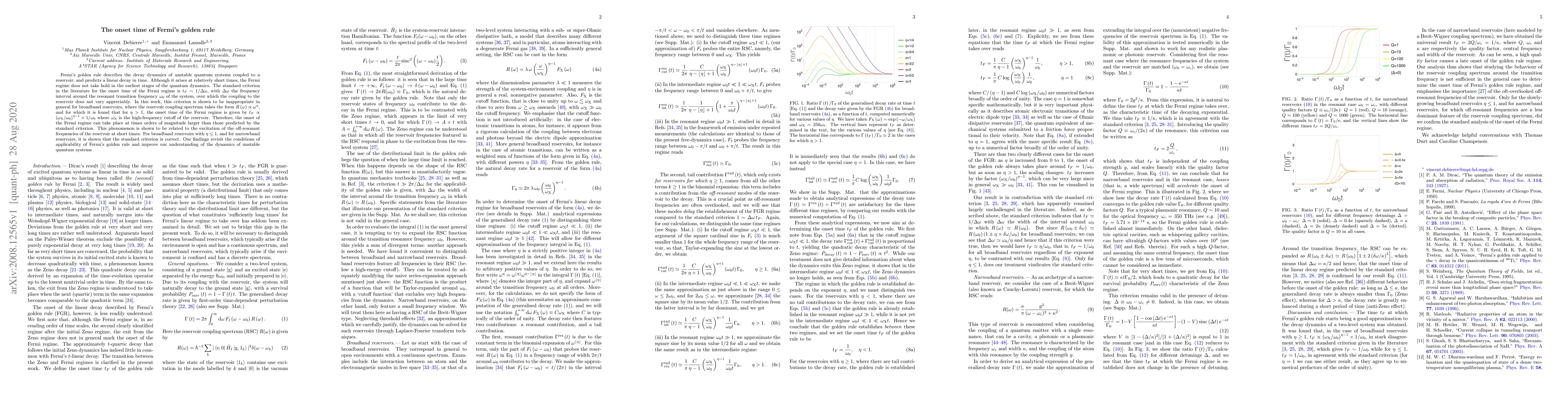 Fermi's golden rule describes the decay dynamics of unstable quantum systems coupled to a reservoir, and predicts a linear decay in time. Although it arises at relatively short times, the Fermi regime does not take hold in the earliest stages of the quantum dynamics. The standard criterion in the literature for the onset time of the Fermi regime is $t_F\sim1/\Delta\omega$, with $\Delta\omega$ the frequency interval around the resonant transition frequency $\omega_0$ of the system, over which the coupling to the reservoir does not vary appreciably. In this work, this criterion is shown to be inappropriate in general for broadband reservoirs, where the reservoir coupling spectrum takes the form $R\left(\omega\right)\propto\omega^\eta$, and for which it is found that for $\eta>1$, the onset time of the Fermi regime is given by $t_F\propto\left(\omega_{\mathrm{X}}/\omega_0\right)^{\eta-1}\times1/\omega_0$ where $\omega_{\mathrm{X}}$ is the high-frequency cutoff of the reservoir. Therefore, the onset of the Fermi regime can take place at times orders of magnitude larger than those predicted by the standard criterion. This phenomenon is shown to be related to the excitation of the off-resonant frequencies of the reservoir at short times. For broadband reservoirs with $\eta\leq1$, and for narrowband reservoirs, it is shown that the standard criterion is correct. Our findings revisit the conditions of applicability of Fermi's golden rule and improve our understanding of the dynamics of unstable quantum systems.