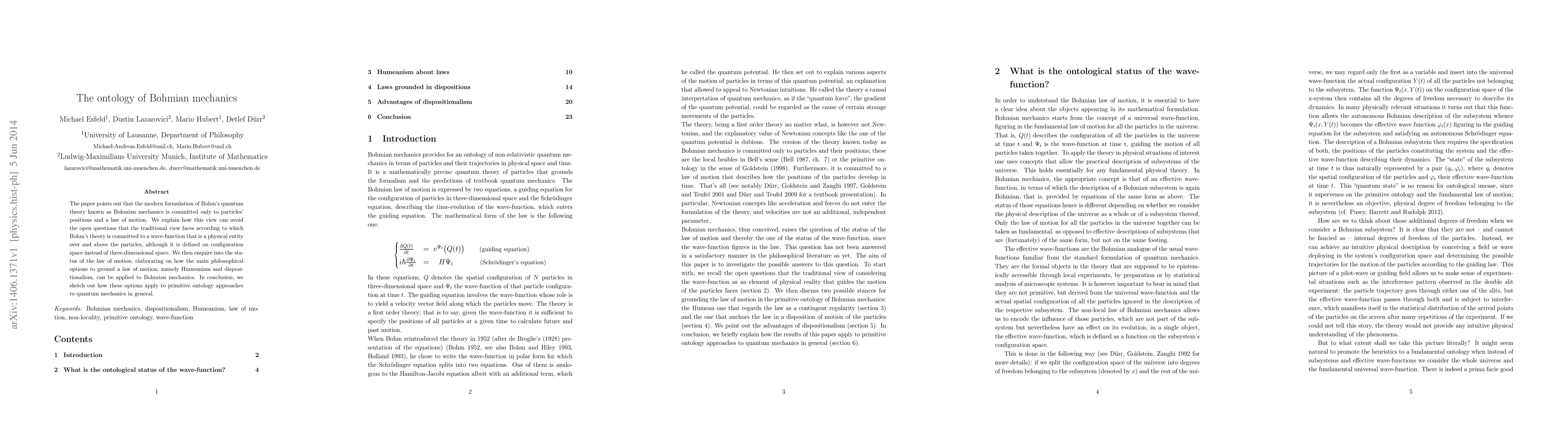 The paper points out that the modern formulation of Bohm's quantum theory known as Bohmian mechanics is committed only to particles' positions and a law of motion. We explain how this view can avoid the open questions that the traditional view faces according to which Bohm's theory is committed to a wave-function that is a physical entity over and above the particles, although it is defined on configuration space instead of three-dimensional space. We then enquire into the status of the law of motion, elaborating on how the main philosophical options to ground a law of motion, namely Humeanism and dispositionalism, can be applied to Bohmian mechanics. In conclusion, we sketch out how these options apply to primitive ontology approaches to quantum mechanics in general.