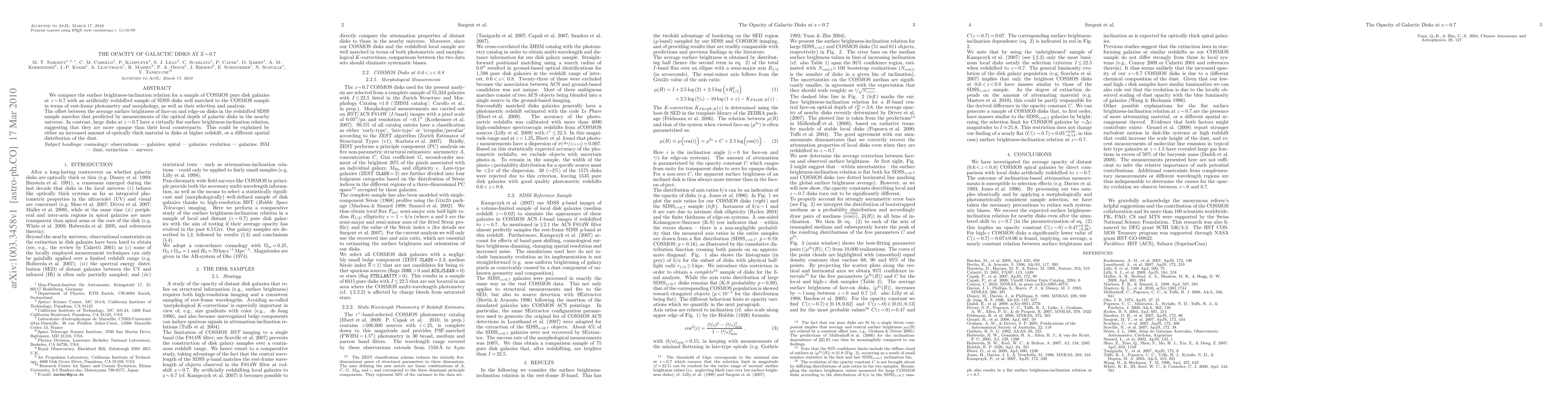 We compare the surface brightness-inclination relation for a sample of COSMOS pure disk galaxies at z~0.7 with an artificially redshifted sample of SDSS disks well matched to the COSMOS sample in terms of rest-frame photometry and morphology, as well as their selection and analysis. The offset between the average surface brightness of face-on and edge-on disks in the redshifted SDSS sample matches that predicted by measurements of the optical depth of galactic disks in the nearby universe. In contrast, large disks at z~0.7 have a virtually flat surface brightness-inclination relation, suggesting that they are more opaque than their local counterparts. This could be explained by either an increased amount of optically thick material in disks at higher redshift, or a different spatial distribution of the dust.