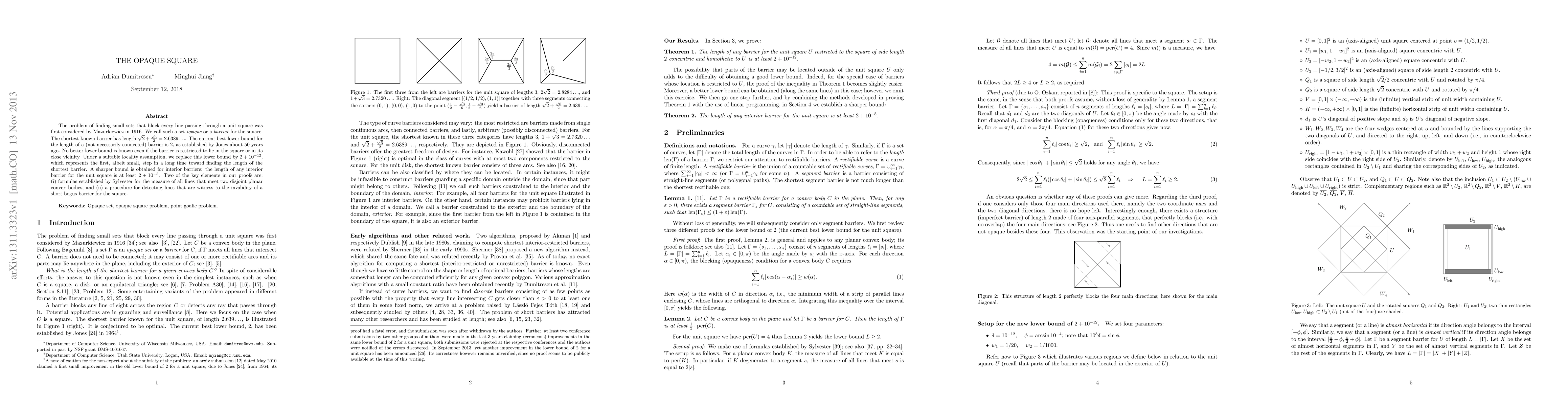 The problem of finding small sets that block every line passing through a unit square was first considered by Mazurkiewicz in 1916. We call such a set {\em opaque} or a {\em barrier} for the square. The shortest known barrier has length $\sqrt{2}+ \frac{\sqrt{6}}{2}= 2.6389\ldots$. The current best lower bound for the length of a (not necessarily connected) barrier is $2$, as established by Jones about 50 years ago. No better lower bound is known even if the barrier is restricted to lie in the square or in its close vicinity. Under a suitable locality assumption, we replace this lower bound by $2+10^{-12}$, which represents the first, albeit small, step in a long time toward finding the length of the shortest barrier. A sharper bound is obtained for interior barriers: the length of any interior barrier for the unit square is at least $2 + 10^{-5}$. Two of the key elements in our proofs are: (i) formulas established by Sylvester for the measure of all lines that meet two disjoint planar convex bodies, and (ii) a procedure for detecting lines that are witness to the invalidity of a short bogus barrier for the square.