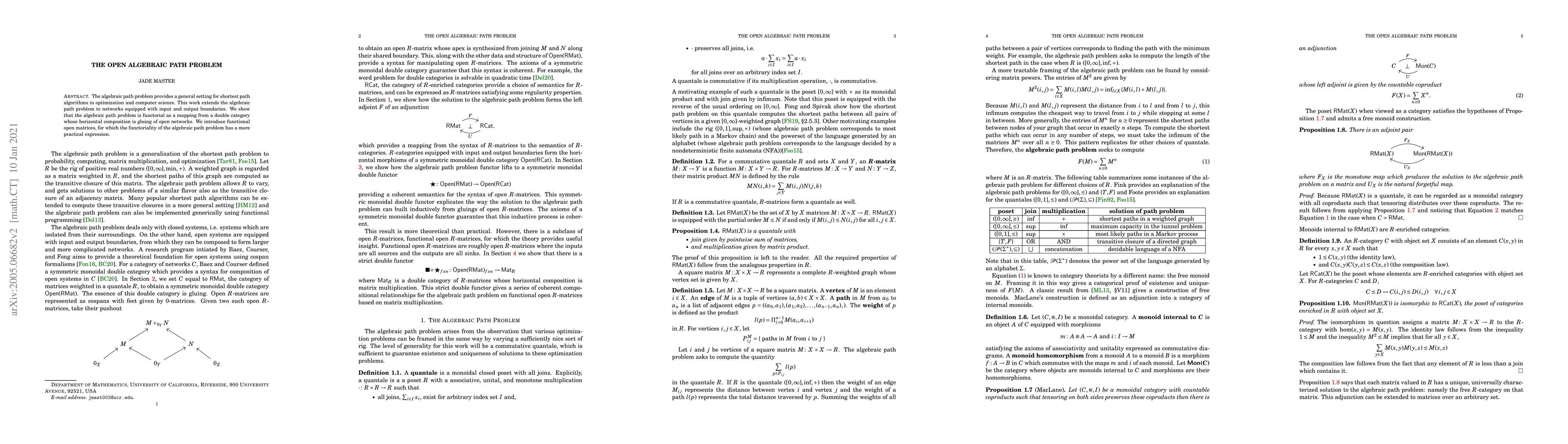 The algebraic path problem provides a general setting for shortest path algorithms in optimization and computer science. This work extends the algebraic path problem to networks equipped with input and output boundaries. We show that the algebraic path problem is functorial as a mapping from a double category whose horizontal composition is gluing of open networks. We introduce functional open matrices, for which the functoriality of the algebraic path problem has a more practical expression.