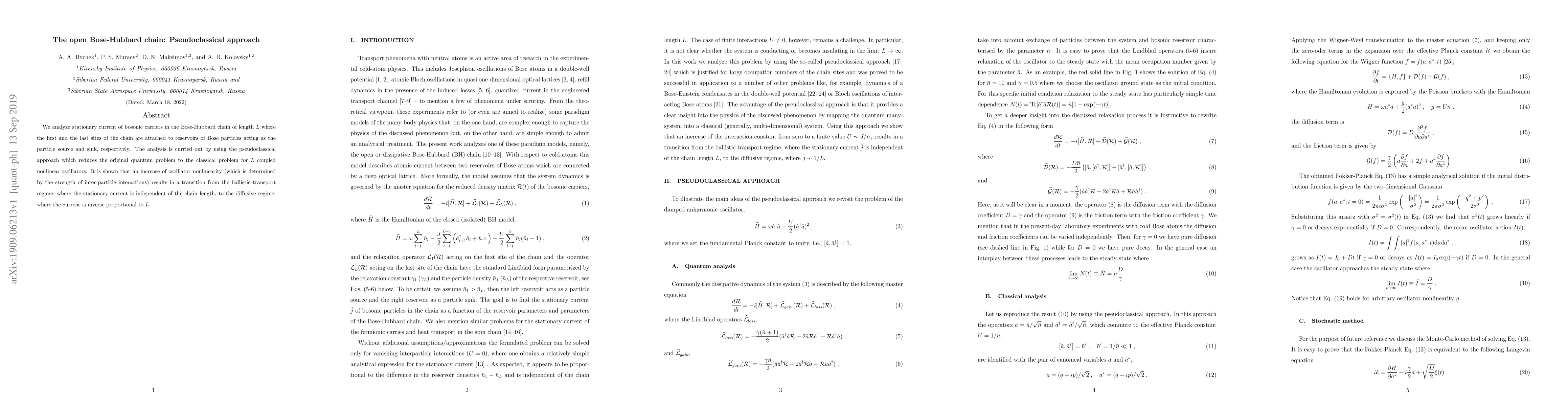This paper investigates the stationary current in an open Bose-Hubbard chain using a pseudoclassical approach, transforming the quantum problem into a classical one for coupled nonlinear oscillators. It finds that increased inter-particle interaction leads to a transition from ballistic to diffusive transport, altering the current's dependence on chain length.