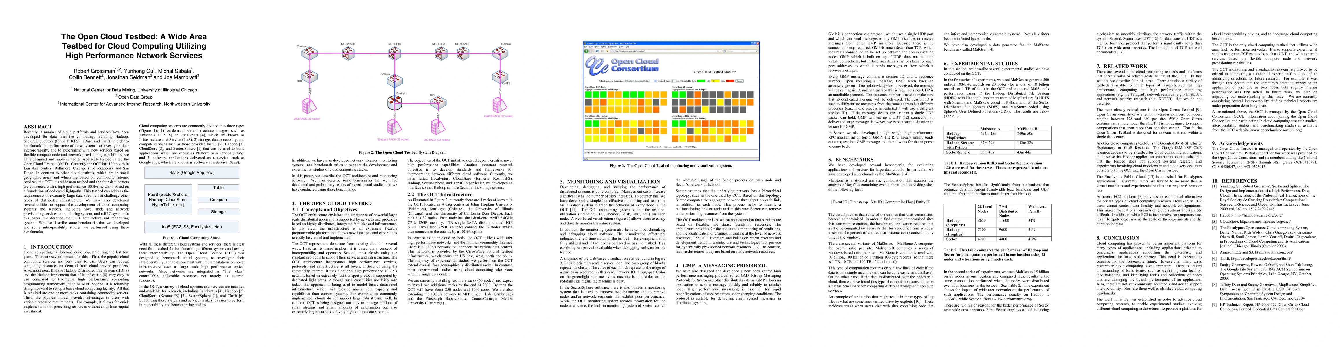 The Open Cloud Testbed (OCT) is a large-scale, wide-area testbed with 120 nodes across four data centers connected via a high-performance 10Gb/s network. It supports cloud computing research through flexible compute and network provisioning, along with benchmarks and interoperability studies.
