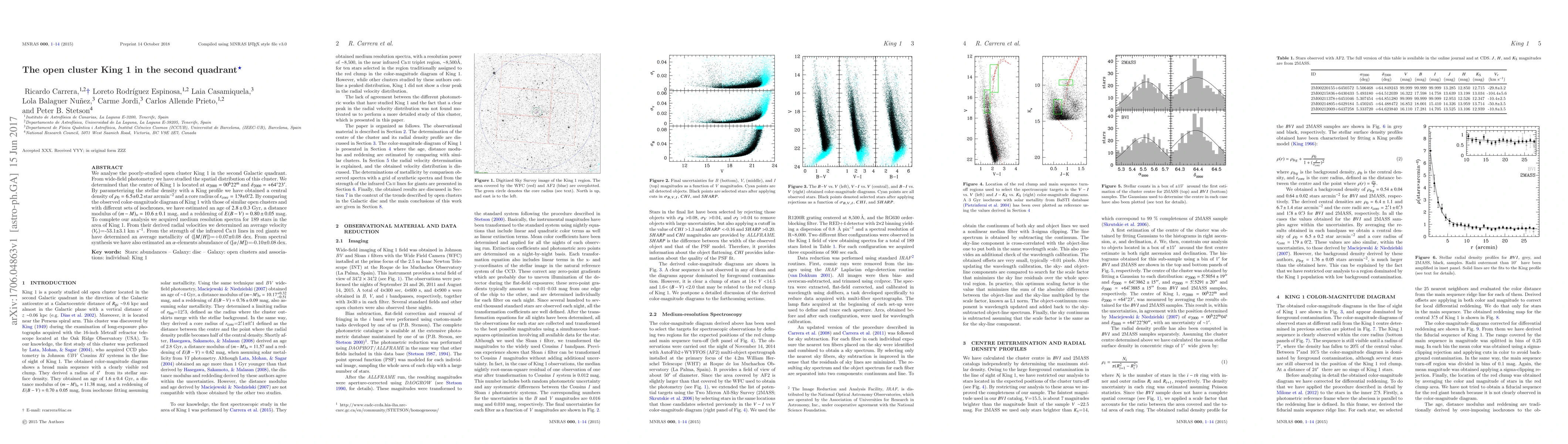 This study analyzes the open cluster King~1 in the second Galactic quadrant, determining its center at $\alpha_{2000}=00^{\rm h}22^{\rm m}$ and $\delta_{2000}=+64\degr23\arcmin$. The cluster is estimated to be 2.8±0.3 Gyr old, with an average radial velocity of -53.1±3.1 km s$^{-1}$ and an average metallicity of +0.07±0.08 dex.