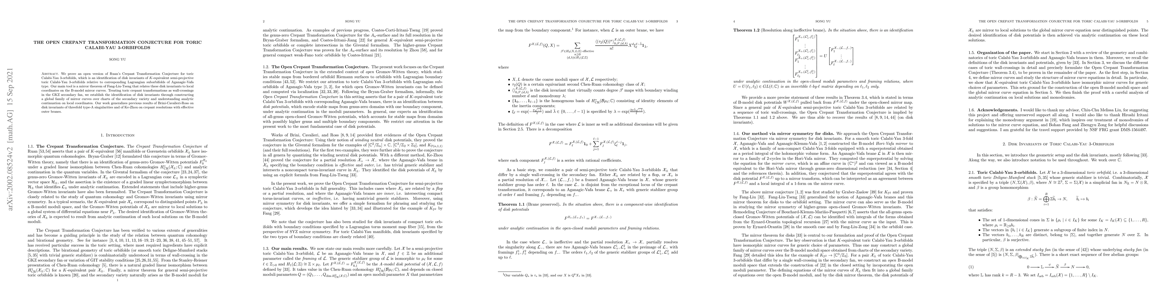 This paper proves an open version of Ruan's Crepant Transformation Conjecture for toric Calabi-Yau 3-orbifolds, establishing an identification of disk invariants relative to corresponding Lagrangian suborbifolds. The authors use a mirror theorem and construct a global family of mirror curves to achieve this identification.