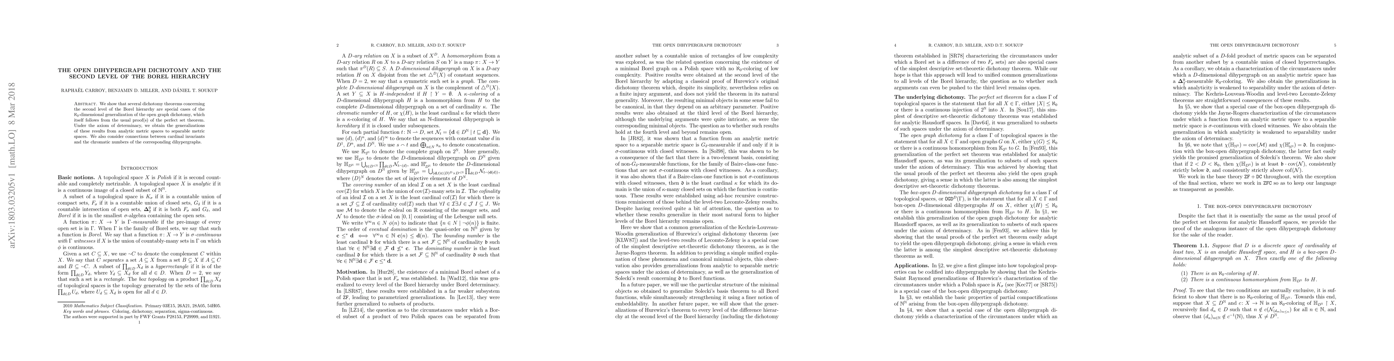 We show that several dichotomy theorems concerning the second level of the Borel hierarchy are special cases of the $\aleph_0$-dimensional generalization of the open graph dichotomy, which itself follows from the usual proof(s) of the perfect set theorem. Under the axiom of determinacy, we obtain the generalizations of these results from analytic metric spaces to separable metric spaces. We also consider connections between cardinal invariants and the chromatic numbers of the corresponding dihypergraphs.