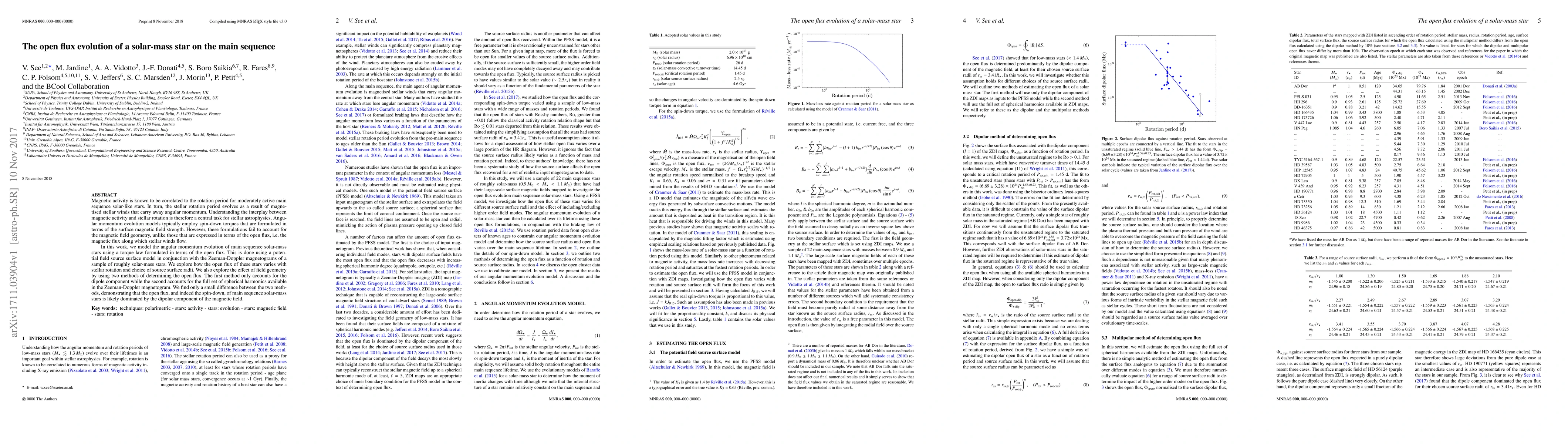 Magnetic activity is known to be correlated to the rotation period for moderately active main sequence solar-like stars. In turn, the stellar rotation period evolves as a result of magnetised stellar winds that carry away angular momentum. Understanding the interplay between magnetic activity and stellar rotation is therefore a central task for stellar astrophysics. Angular momentum evolution models typically employ spin-down torques that are formulated in terms of the surface magnetic field strength. However, these formulations fail to account for the magnetic field geometry, unlike those that are expressed in terms of the open flux, i.e. the magnetic flux along which stellar winds flow. In this work, we model the angular momentum evolution of main sequence solar-mass stars using a torque law formulated in terms of the open flux. This is done using a potential field source surface model in conjunction with the Zeeman-Doppler magnetograms of a sample of roughly solar-mass stars. We explore how the open flux of these stars varies with stellar rotation and choice of source surface radii. We also explore the effect of field geometry by using two methods of determining the open flux. The first method only accounts for the dipole component while the second accounts for the full set of spherical harmonics available in the Zeeman-Doppler magnetogram. We find only a small difference between the two methods, demonstrating that the open flux, and indeed the spin-down, of main sequence solar-mass stars is likely dominated by the dipolar component of the magnetic field.
