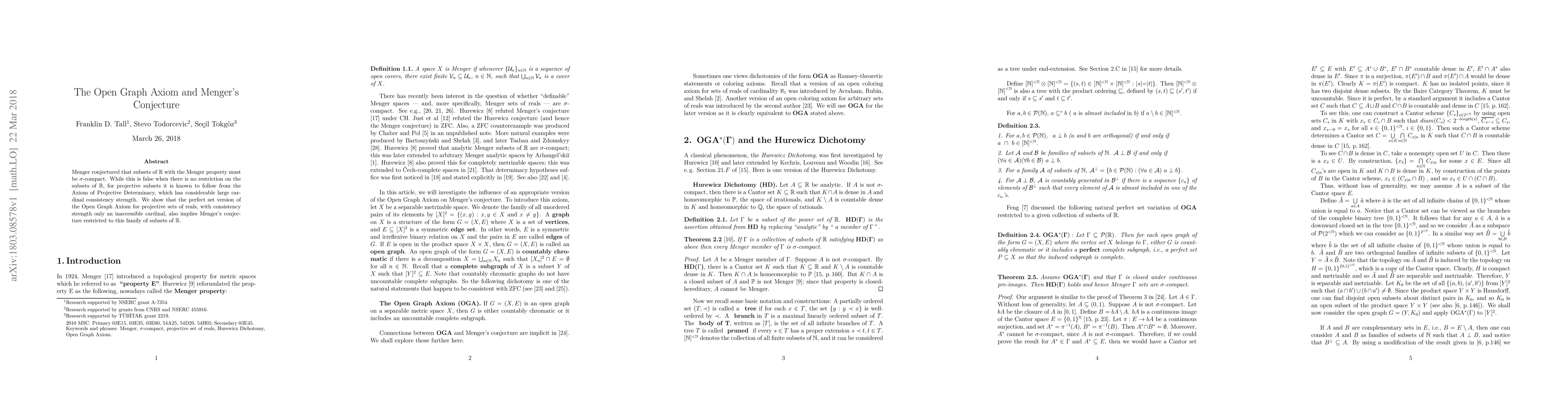 This paper demonstrates that the perfect set version of the Open Graph Axiom for projective sets of reals implies Menger's conjecture for projective subsets, showing that the axiom's consistency strength is an inaccessible cardinal, significantly less than that of the Axiom of Projective Determinacy.
