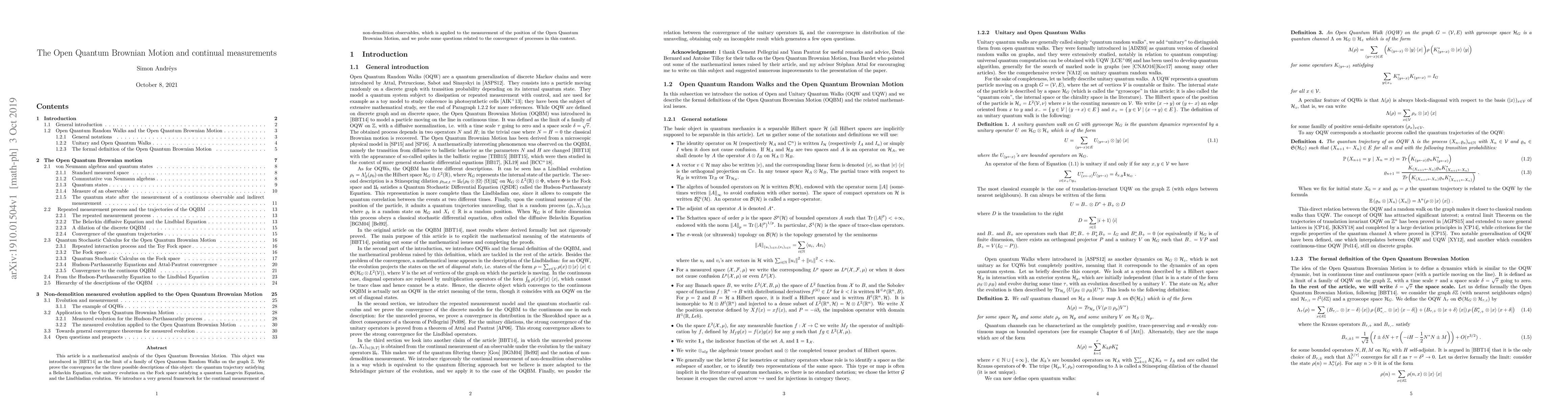 This article is a mathematical analysis of the Open Quantum Brownian Motion. This object was introduced by Bernard, Bauer, Benoist and Tilloy as the limit of a family of Open Quantum Random Walks on the discrete line. We prove the convergence for the three possible descriptions of this object: the quantum trajectory satisfying a Belavkin Equation, the unitary evolution on the Fock space satisfying a quantum Langevin Equation, and the Lindbladian evolution. We introduce a very general framework for the continual measurement of non-demolition observables, which is applied to the measurement of the position of the Open Quantum Brownian Motion, and we probe some questions related to the convergence of processes in this context.