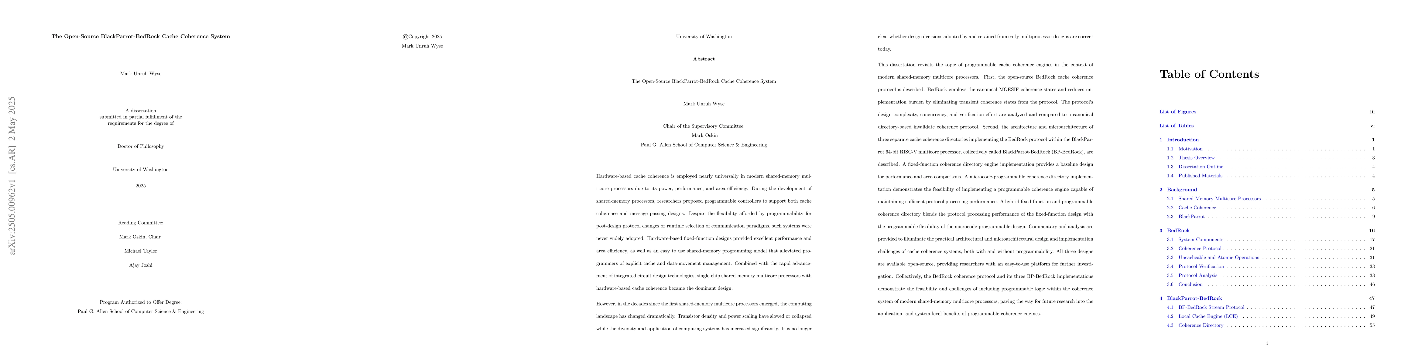 The open-source BedRock cache coherence protocol and its three BlackParrot-BedRock implementations, which showcase fixed-function, microcode-programmable, and hybrid coherence directory designs.