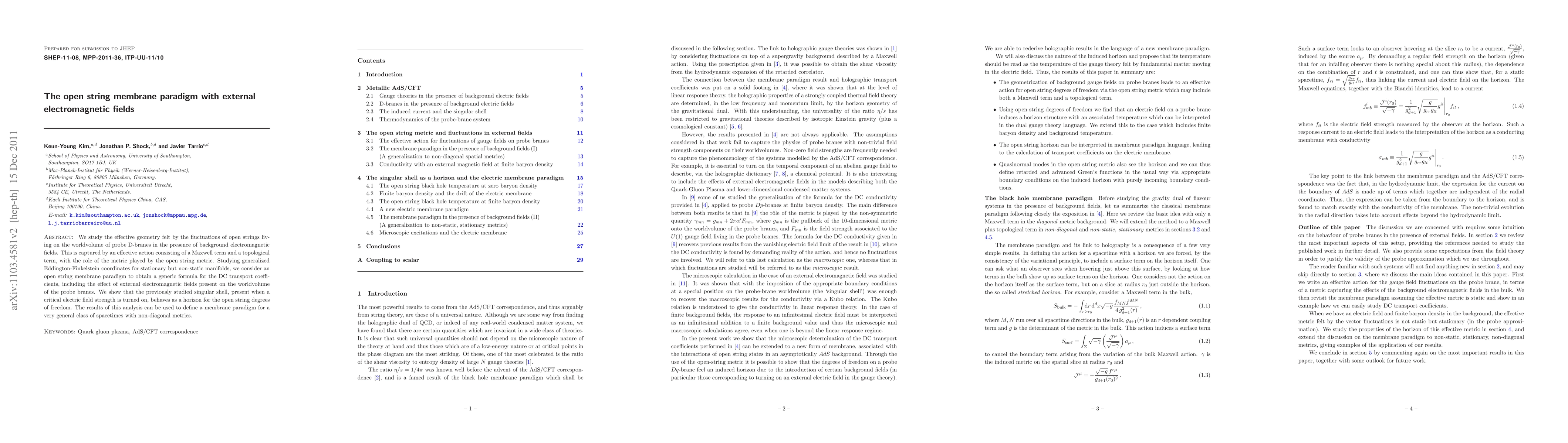 This paper investigates the effective geometry of open string fluctuations on D-branes under background electromagnetic fields, deriving a formula for DC transport coefficients. It reveals the emergence of a horizon-like behavior in the presence of a critical electric field strength, establishing a membrane paradigm applicable to a broad range of spacetimes.