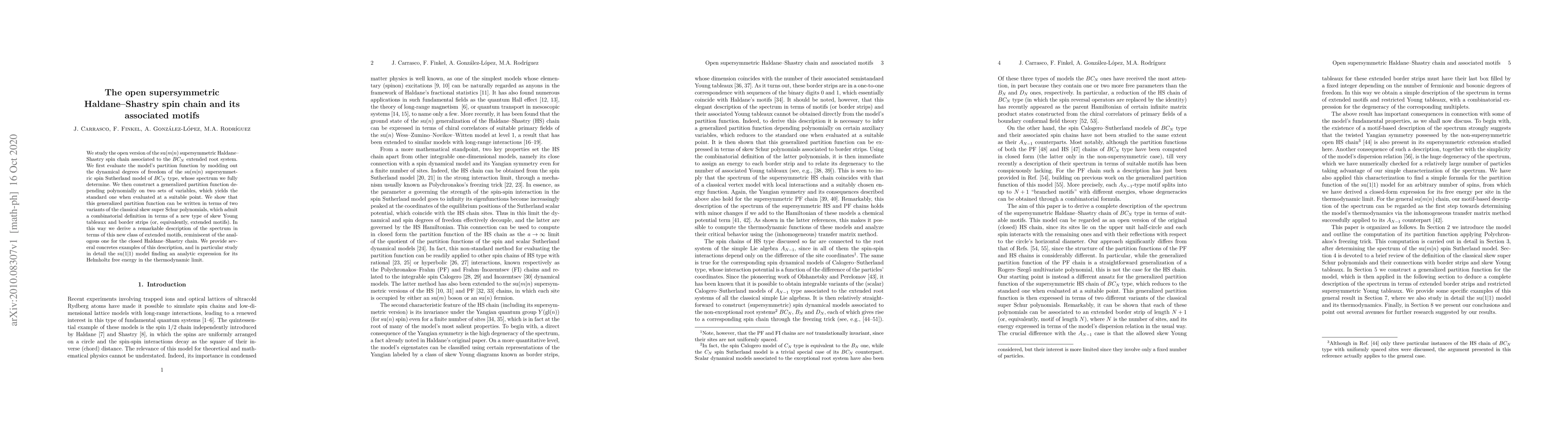 We study the open version of the su$(m|n)$ supersymmetric Haldane-Shastry spin chain associated to the $BC_N$ extended root system. We first evaluate the model's partition function by modding out the dynamical degrees of freedom of the su$(m|n)$ supersymmetric spin Sutherland model of $BC_N$ type, whose spectrum we fully determine. We then construct a generalized partition function depending polynomially on two sets of variables, which yields the standard one when evaluated at a suitable point. We show that this generalized partition function can be written in terms of two variants of the classical skew super Schur polynomials, which admit a combinatorial definition in terms of a new type of skew Young tableaux and border strips (or, equivalently, extended motifs). In this way we derive a remarkable description of the spectrum in terms of this new class of extended motifs, reminiscent of the analogous one for the closed Haldane-Shastry chain. We provide several concretes examples of this description, and in particular study in detail the su$(1|1)$ model finding an analytic expression for its Helmholtz free energy in the thermodynamic limit.